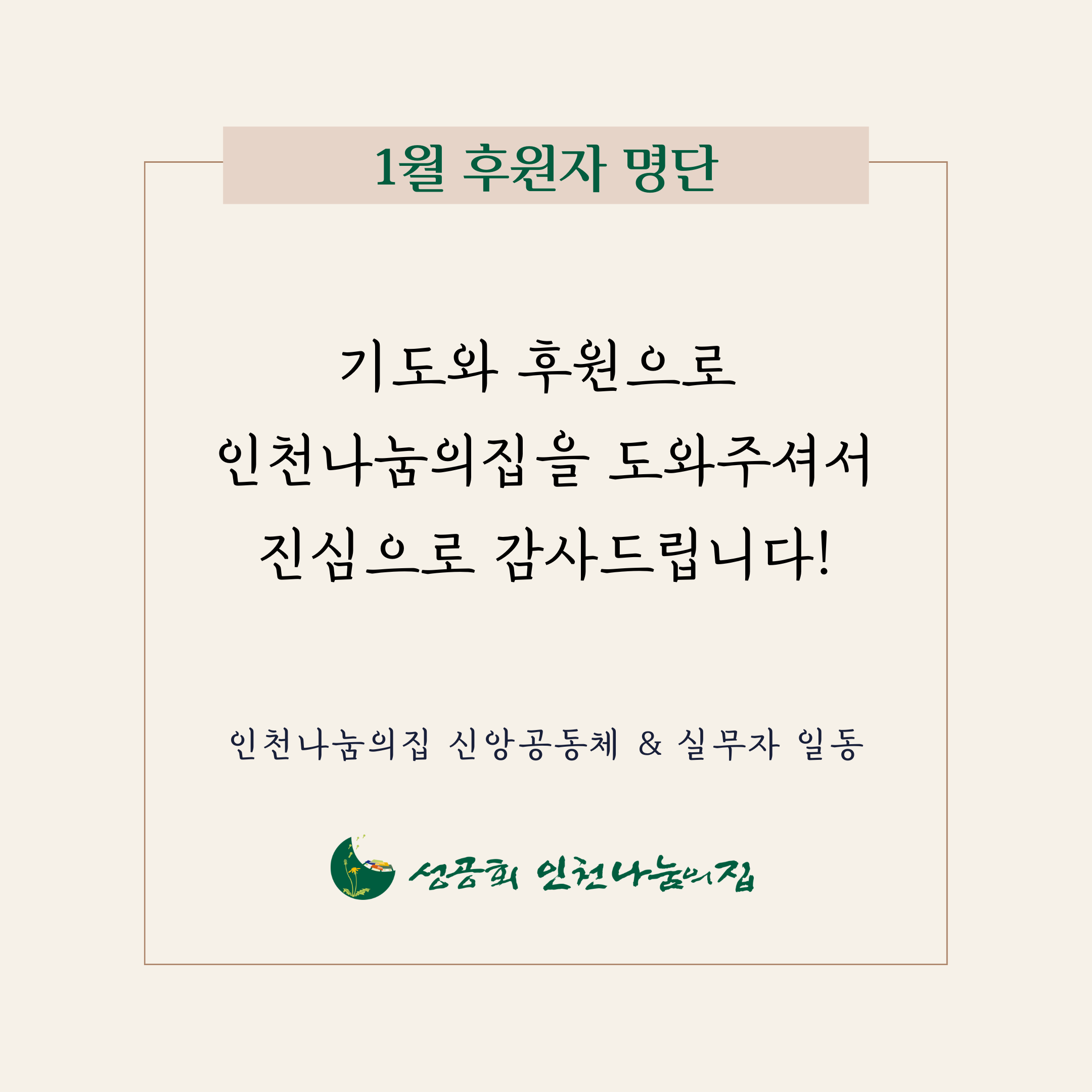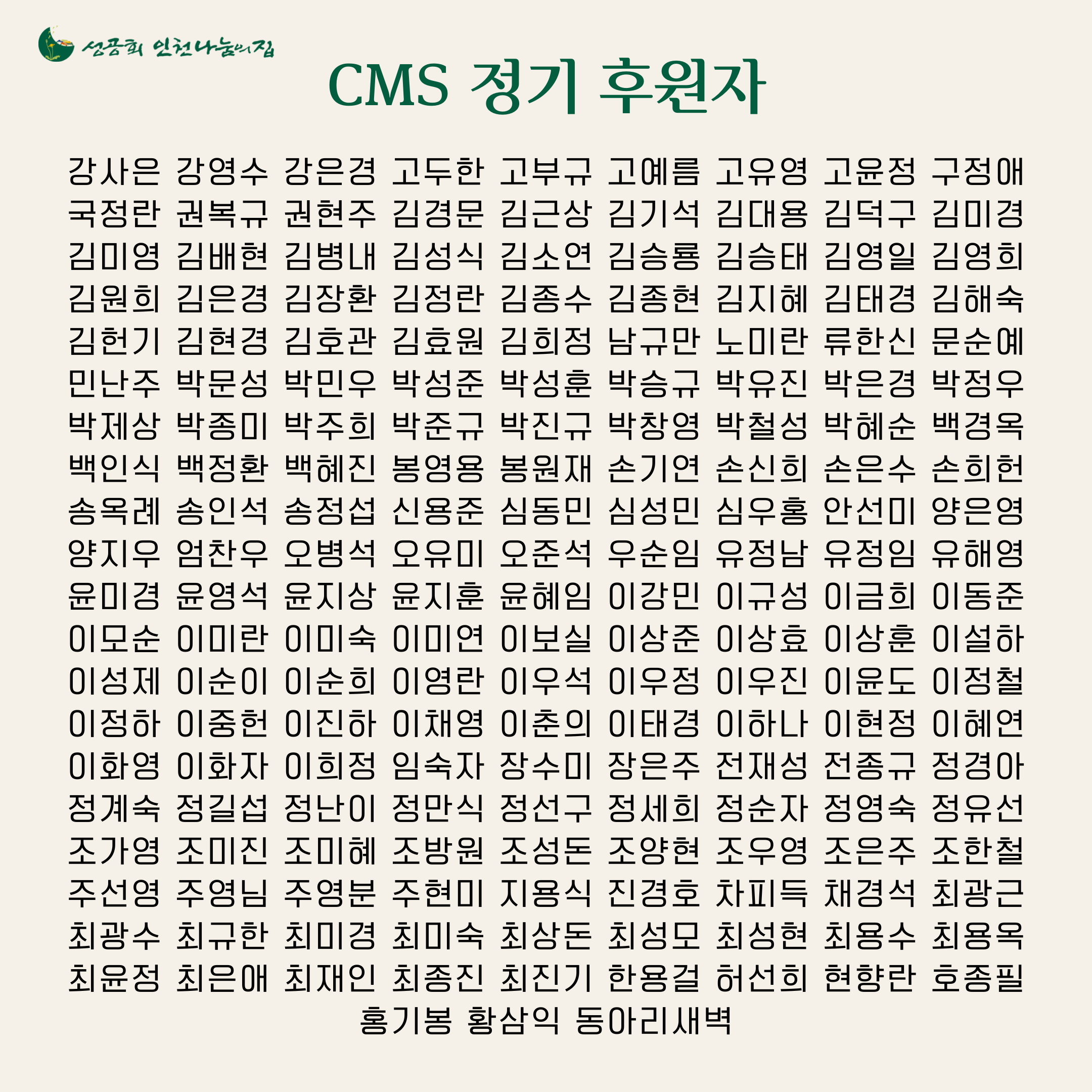 2023년 1월 후원 감사드립니다활동단체/사무국 2023. 2. 1. 13:352023년 1월, 인천나눔의집을 위해 기도와 후원으로 도와주신 모든 분께 진심으로 감사드립니다.오늘 추위는 잦아들었지만 미세먼지로 공기가 탁하네요. 마스크 꼭 쓰시고 건강 잘 챙기시길 바랍니다. 모두 건강하세요!* 혹여 오기나 누락된 후원자분은 이 게시물 아래 댓글로 알려주시거나 나눔의집으로 연락주십시오.* CMS 후원 회원 명단은 CMS 신청 및 등록이 완료되어 후원금이 인출된 분입니다.* CMS 후원 가입 : https://url.kr/kejdym