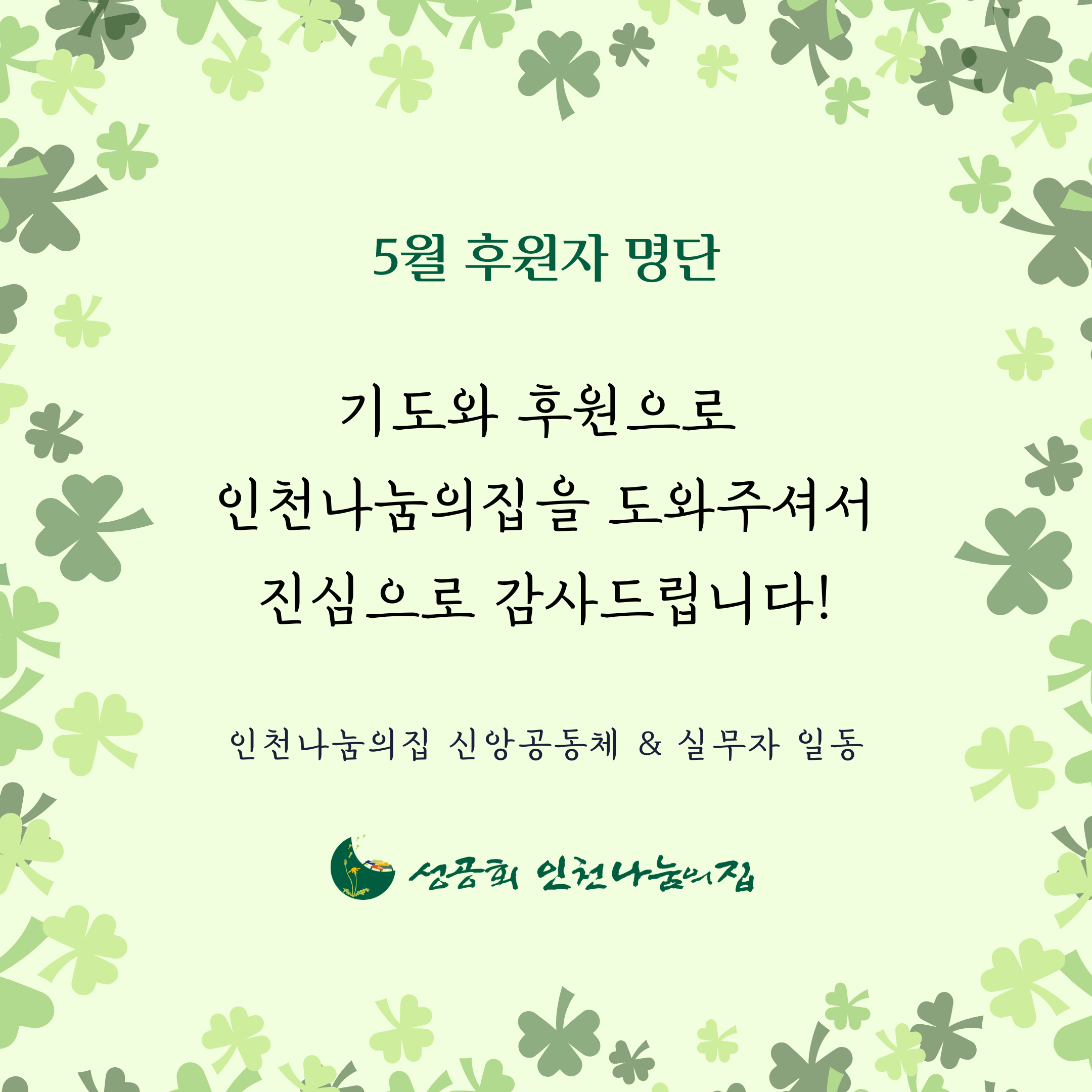 5월 한 달 동안 인천나눔의집을 위해 기도와 후원으로 도와주신 모든 분께 진심으로 감사드립니다.