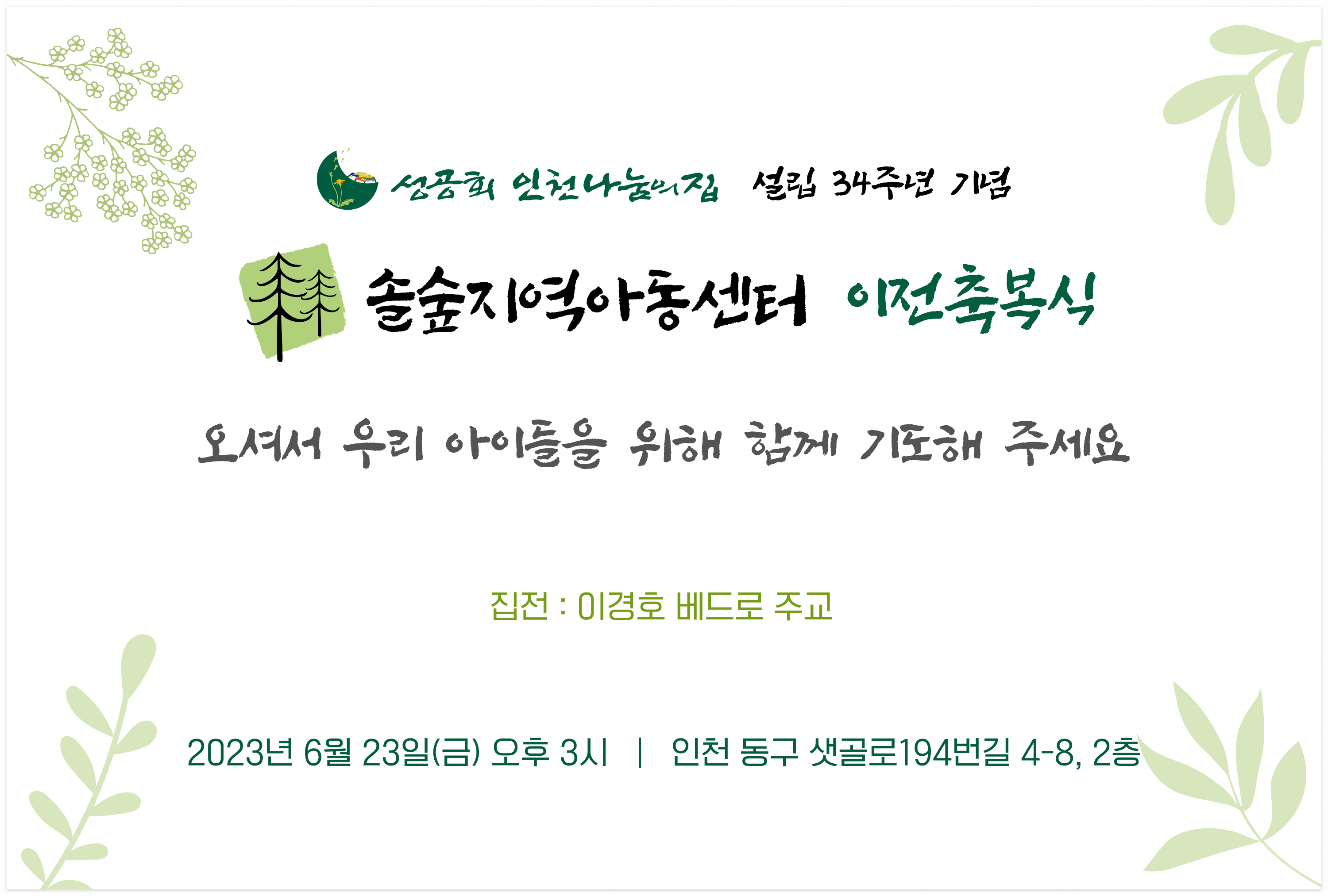 인천나눔의집 설립 34주년 기념과 더불어 솔숲지역아동센터 이전축복식을 오는 6월 23일(금) 오후 3시에 진행합니다. 오셔서 우리 아이들을 위해 함께 기도해 주시고, 솔숲 선생님들을 격려해 주세요!