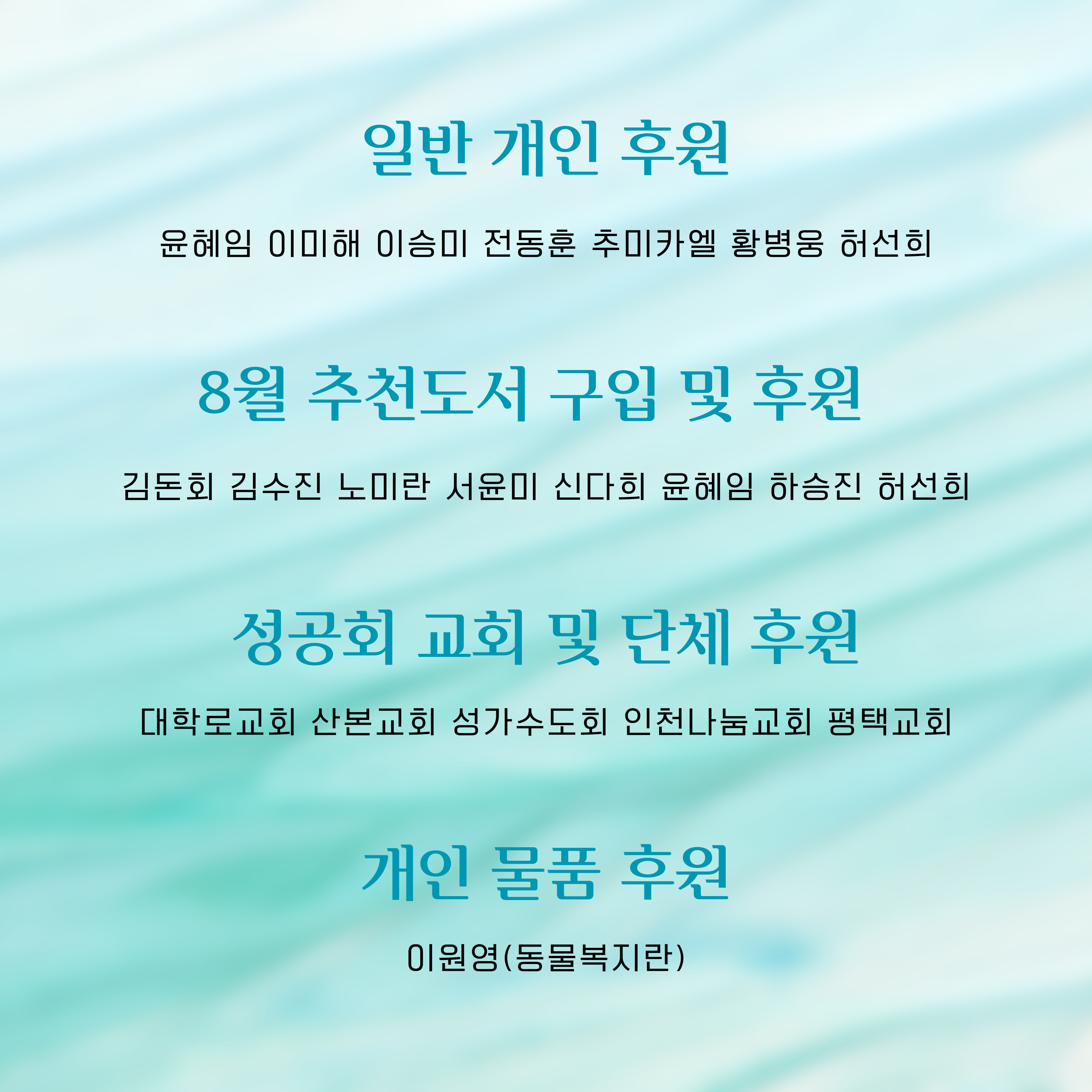 7월 한 달 동안 인천나눔의집을 위해 기도와 후원으로 도와주신 모든 분께 진심으로 감사드립니다.