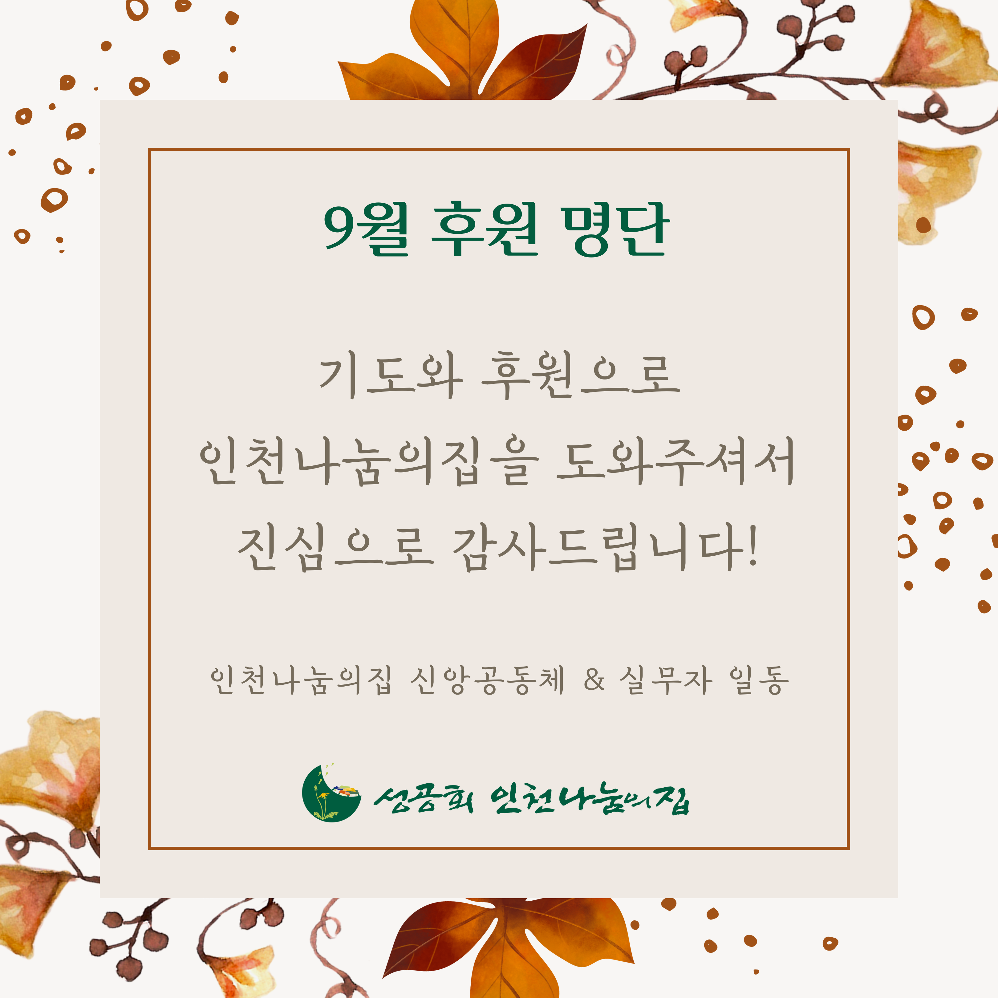 9월 한 달 동안 인천나눔의집을 위해 기도와 후원으로 도와주신 모든 분께 진심으로 감사드립니다.