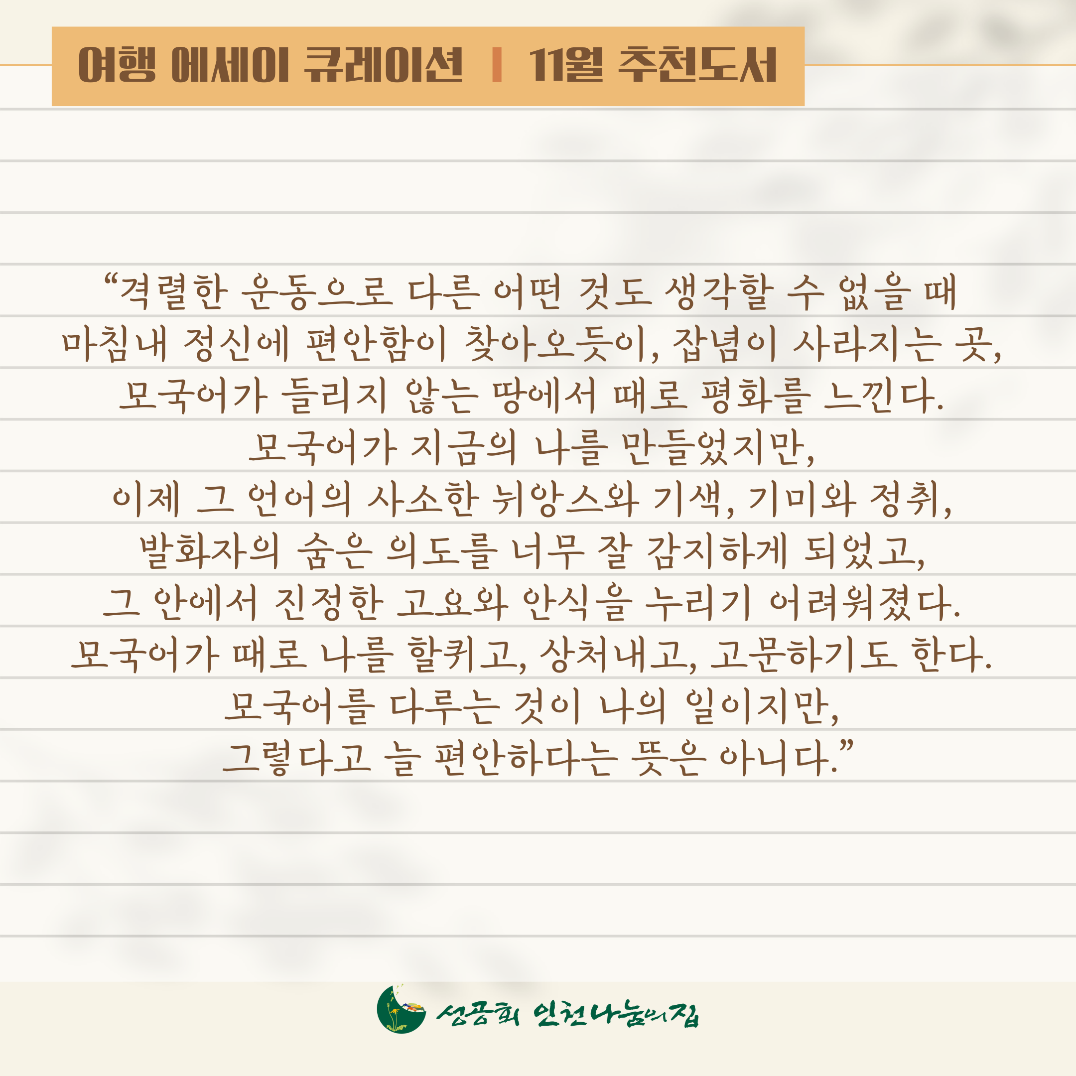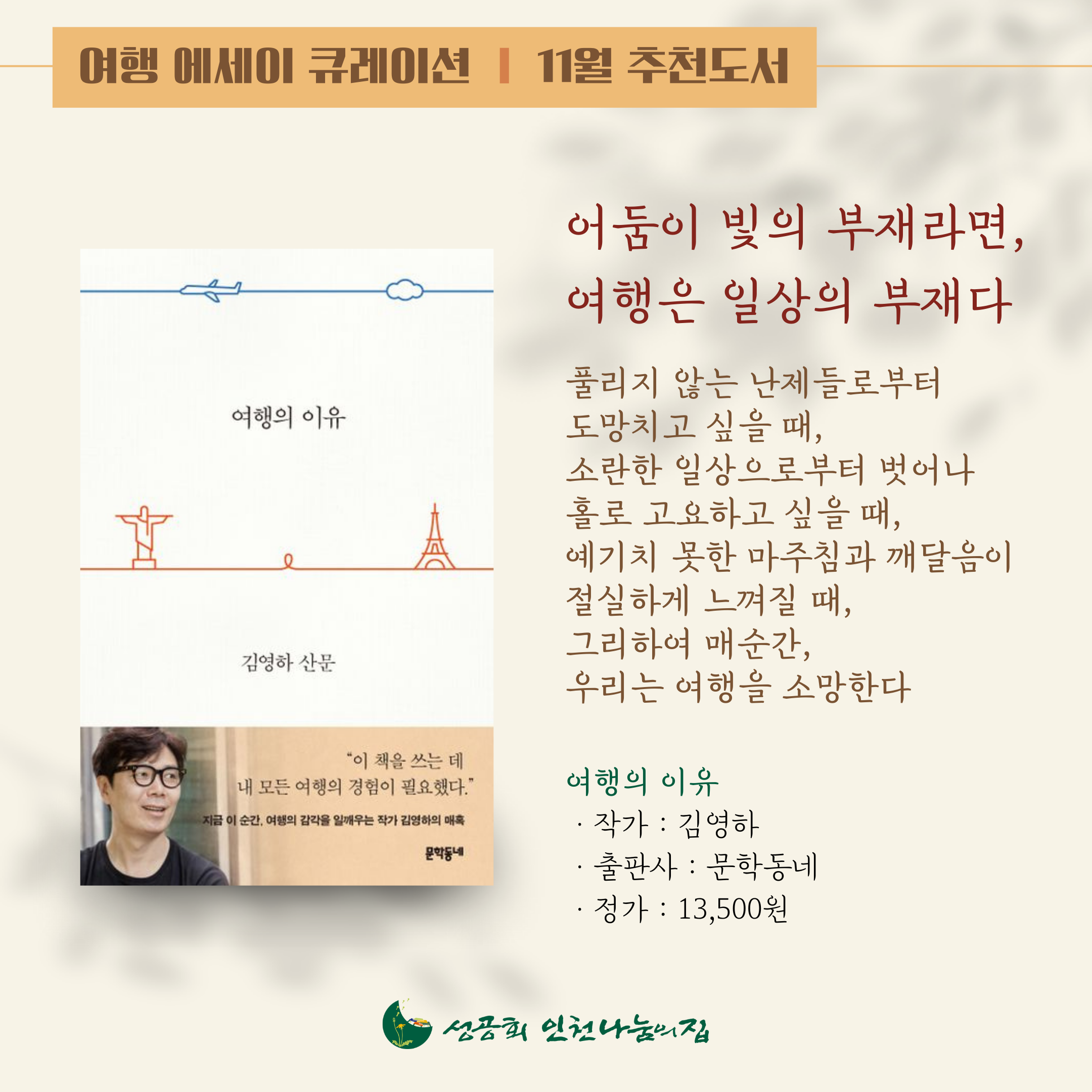 11월 추천도서는 김영하 작가의 《여행의 이유》입니다.
