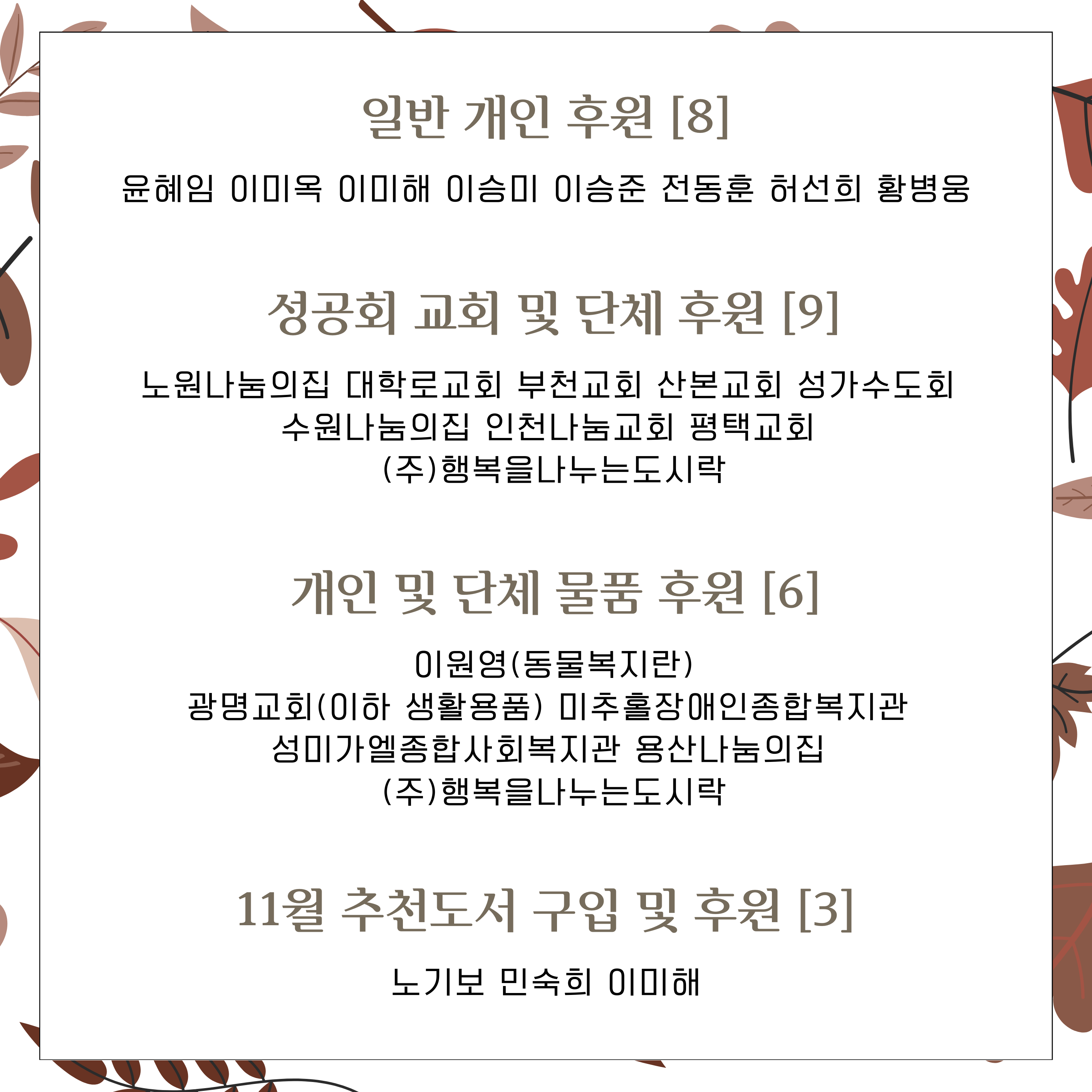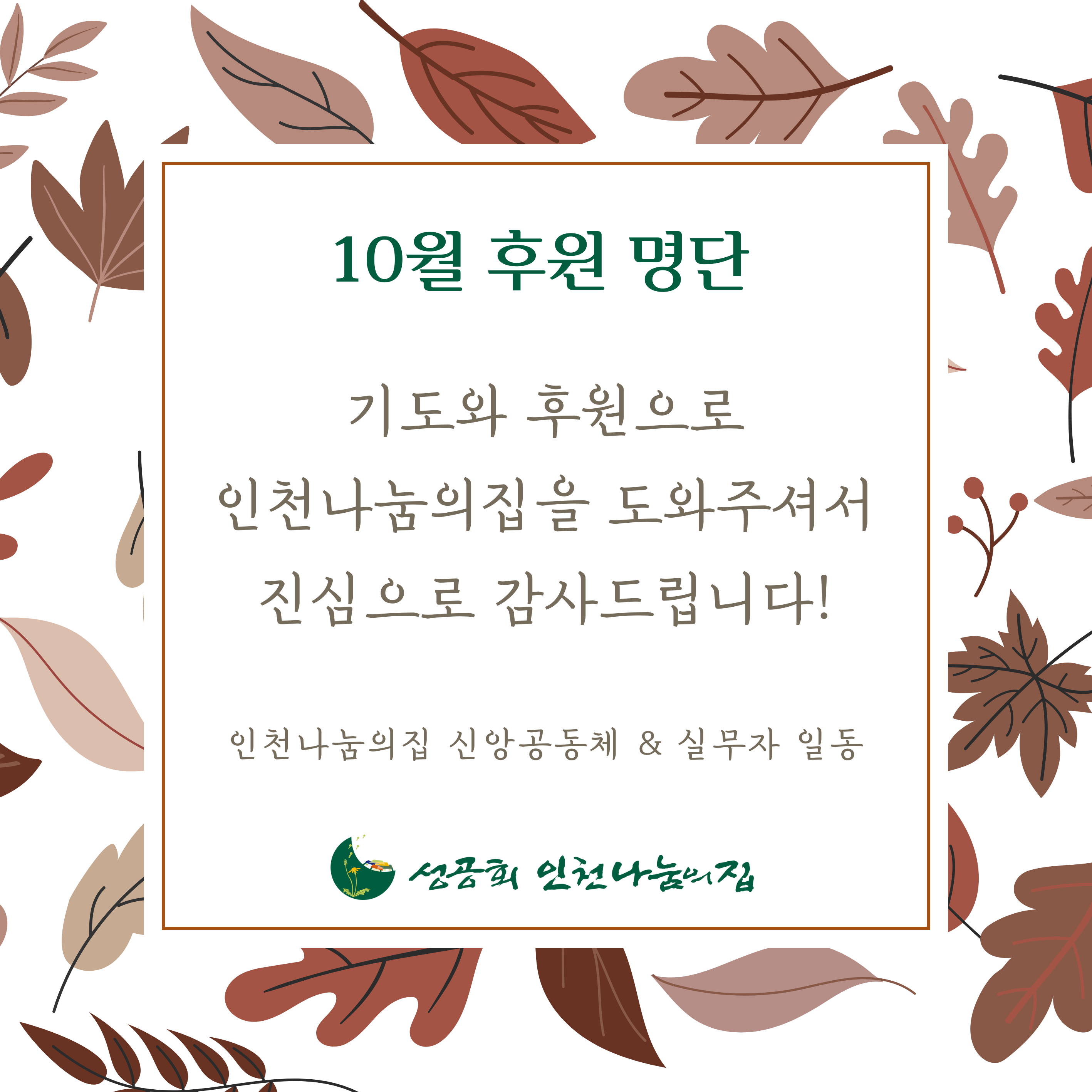 10월 한 달 동안 인천나눔의집을 위해 기도와 후원으로 도와주신 모든 분께 진심으로 감사드립니다!