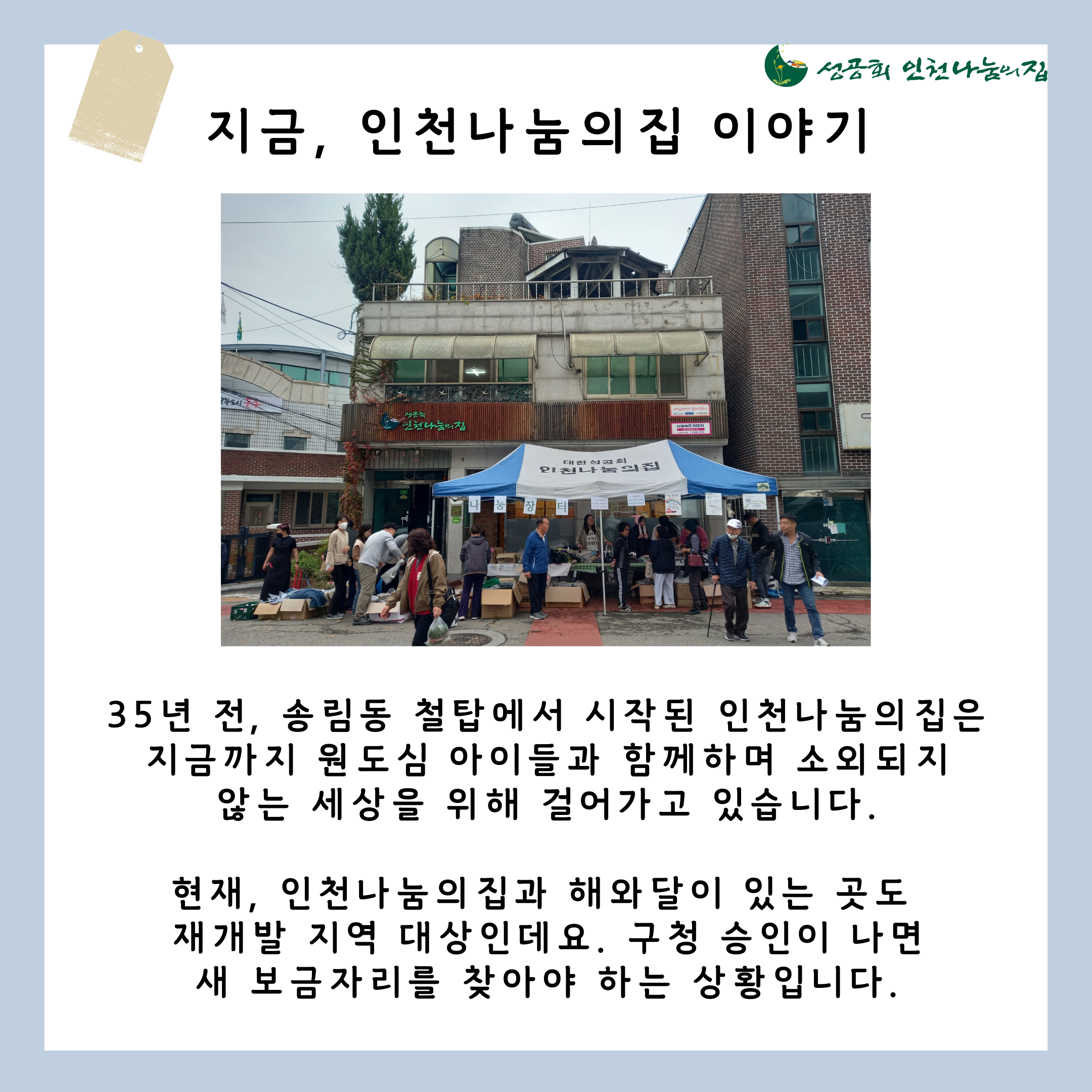 인천나눔의집은 송림동 철탑에서 시작해 여러 번 보금자리를 옮겨가며 지금 자리에서 소외되지 않는 마을을 만들기 위해 지역공동체와 함께하고 있습니다.