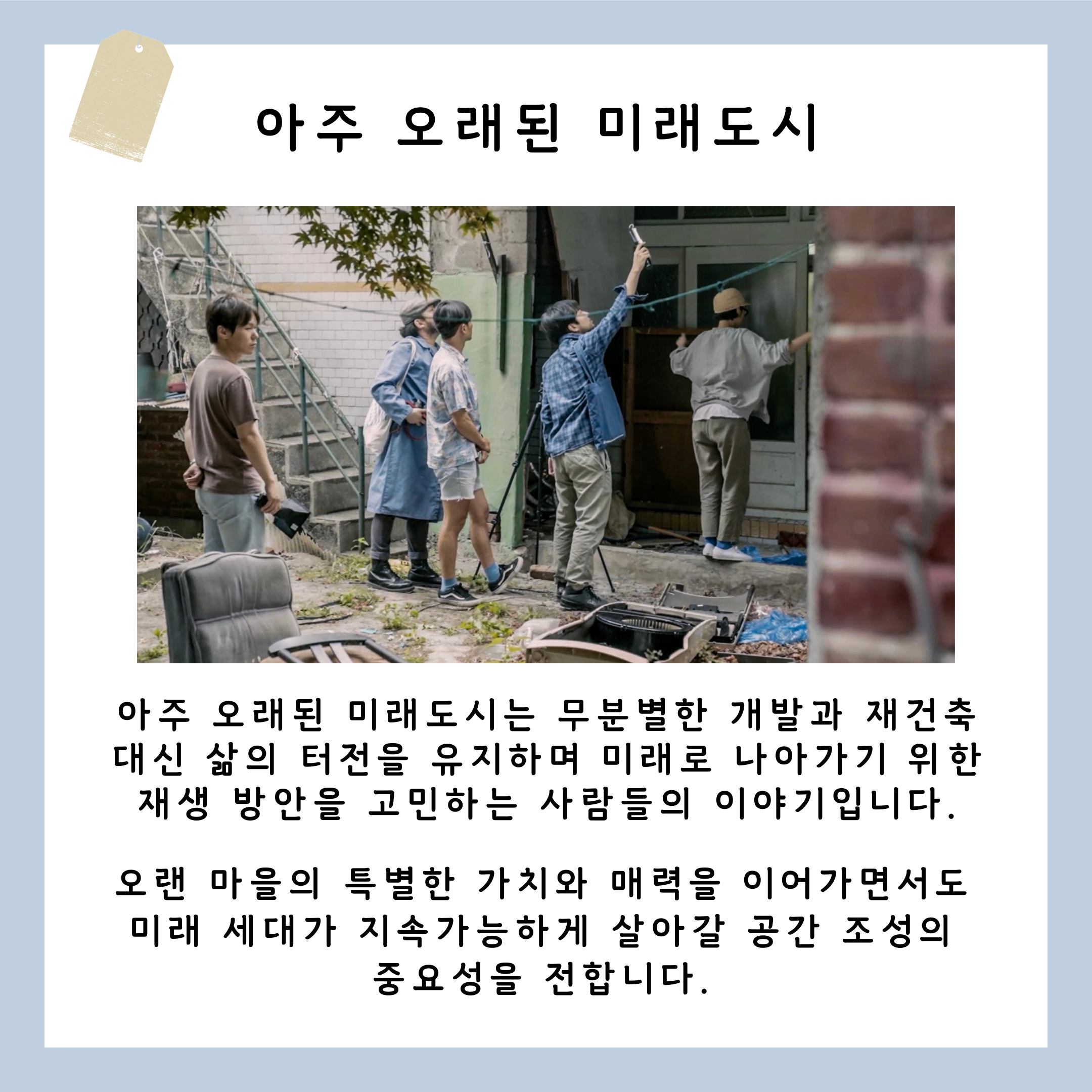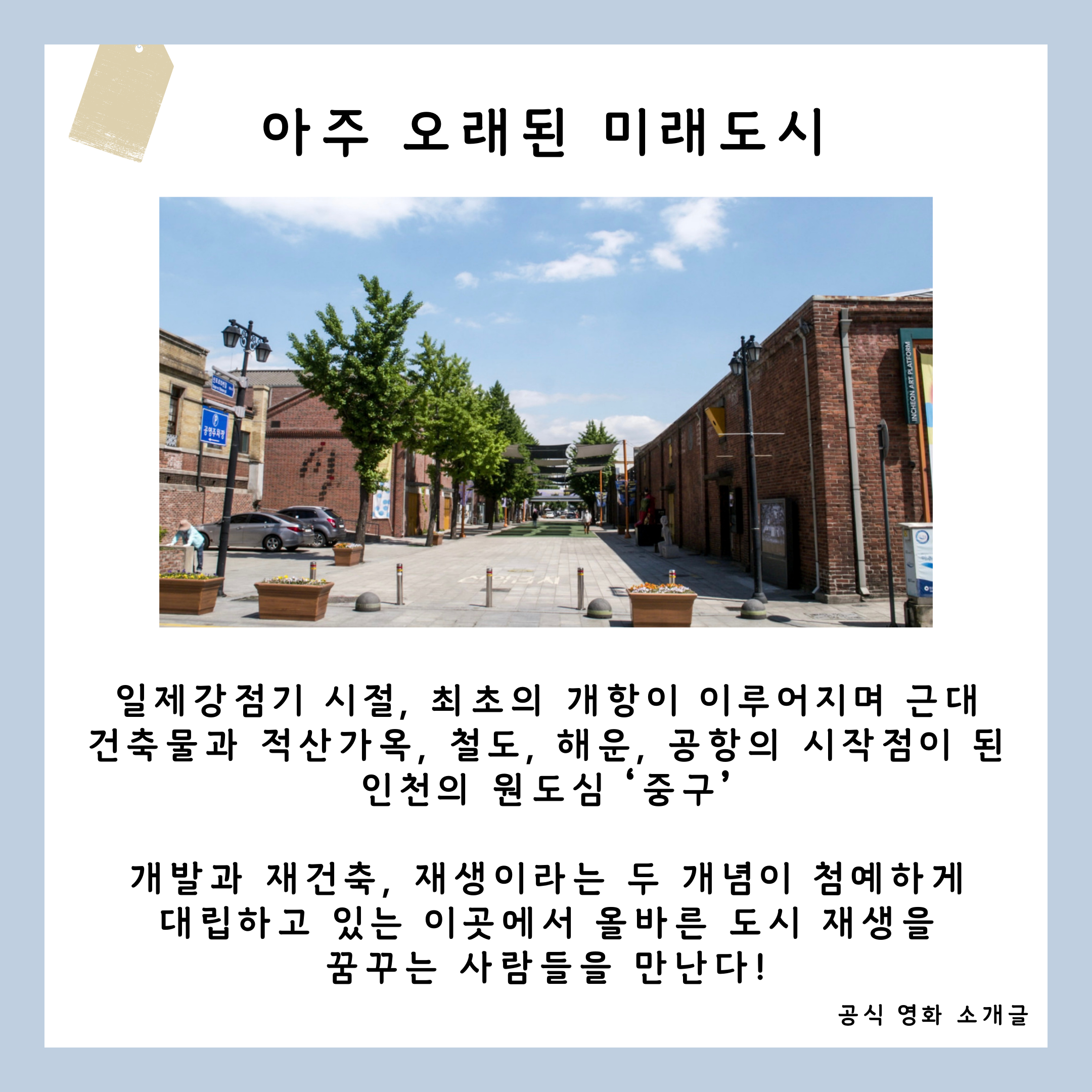 인천나눔의집이 추천하는 이번 주 영화는 ‘아주 오래된 미래도시’입니다! 저번달에 개봉한 이 영화는 인천의 원도심 중구를 중심으로 재개발과 지속 가능한 도시재생에 관해 이야기합니다.
