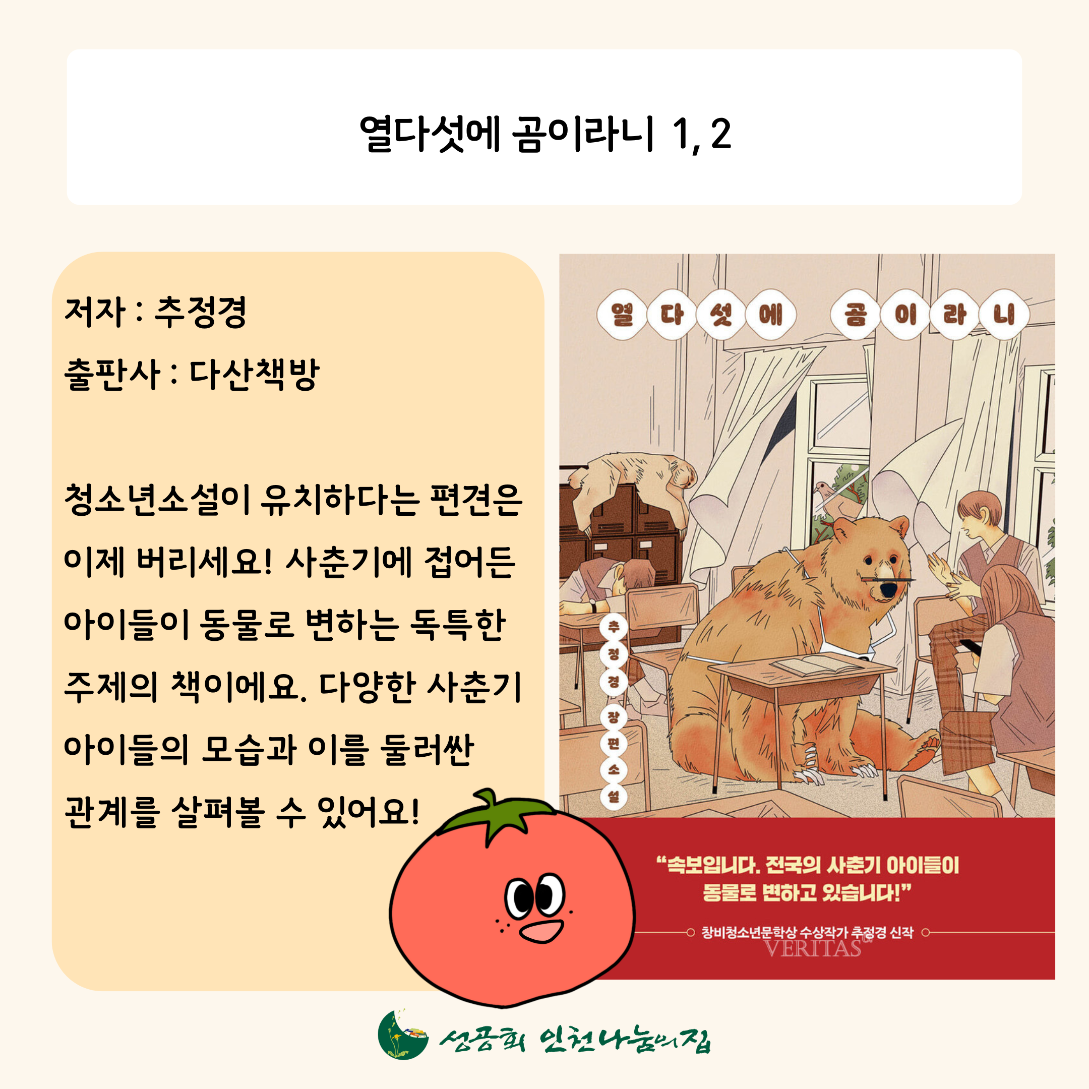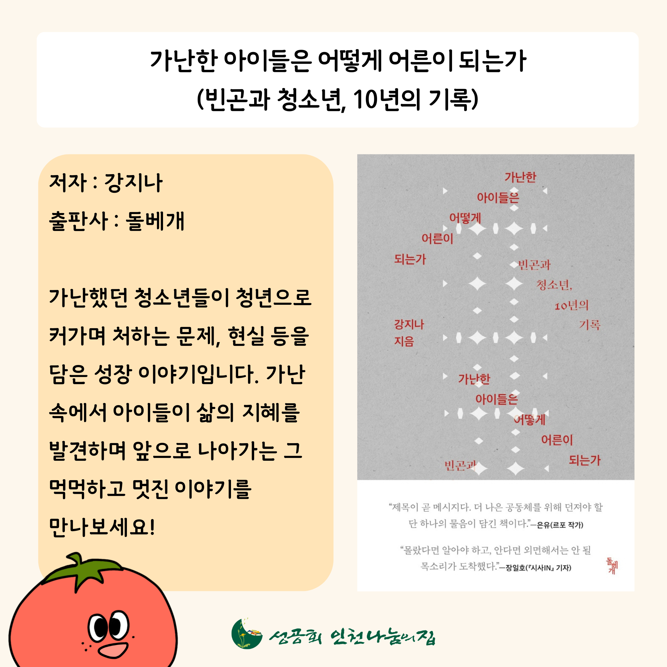 인천나눔의집 토마토 씨가 직접 읽어본 책 3권을 소개합니다! 이번 추석 연휴엔 인천나눔의집과 함께 책을 읽으며 아이들의 성장, 제로웨이스트 삶에 대해 고민해보는 건 어떨까요?