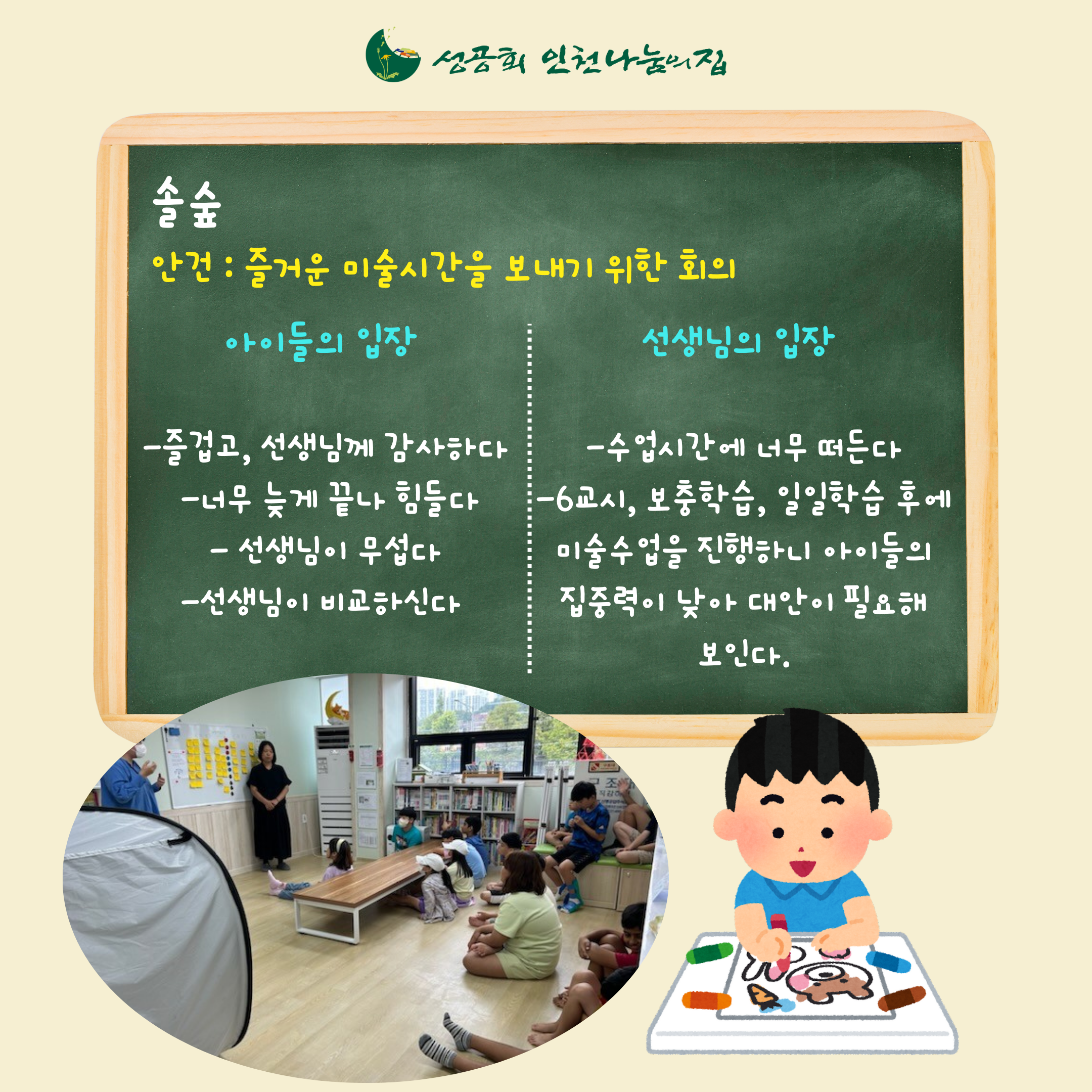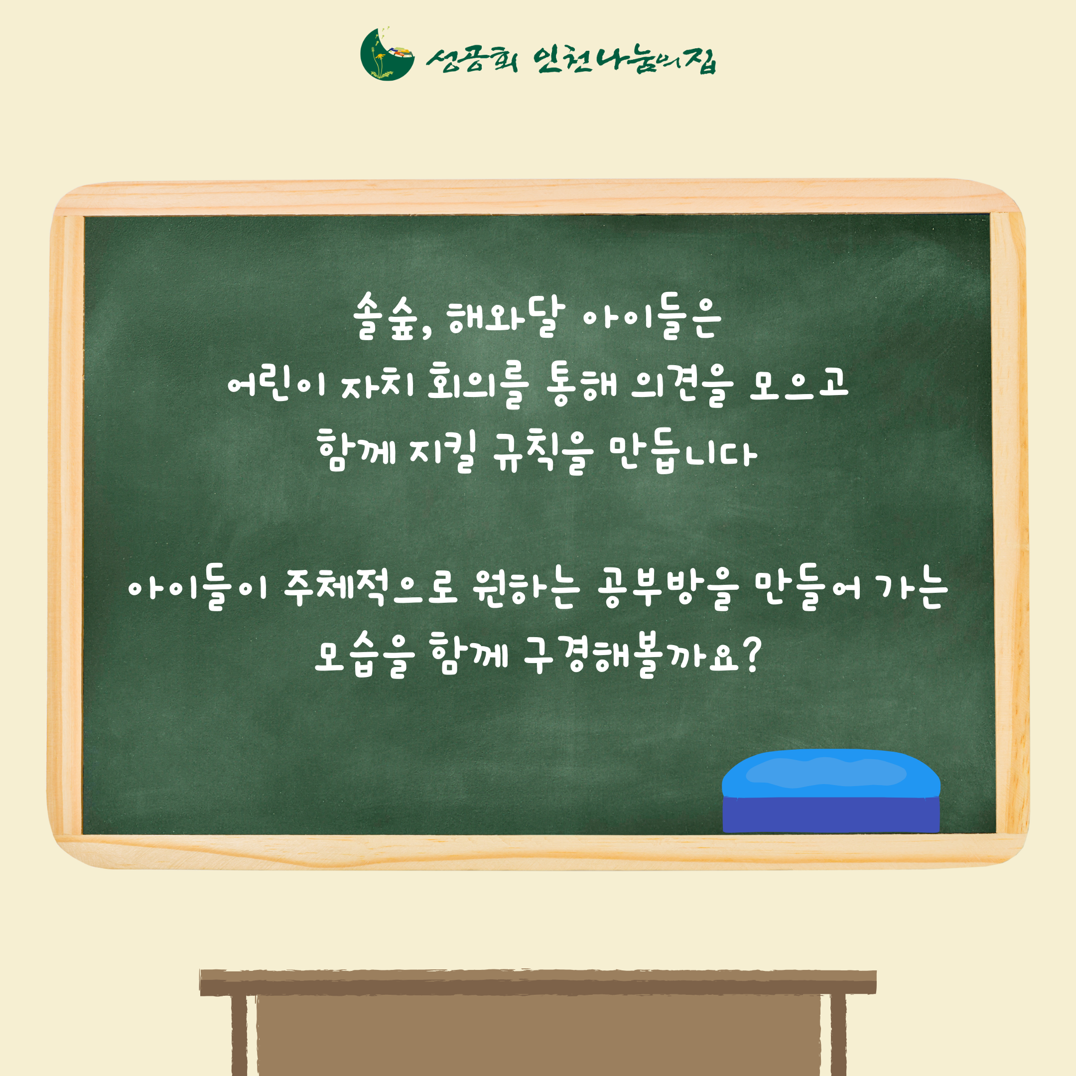 아이들은 학교와 공부방에서 함께 살아가는 방법을 배웁니다. 그리고 그 안에서 자신 있게 자기 의견을 말하는 것도 배울 거에요😺 이번 글에서는 솔숲, 해와달 아이들의 자치회의를 살펴보겠습니다!