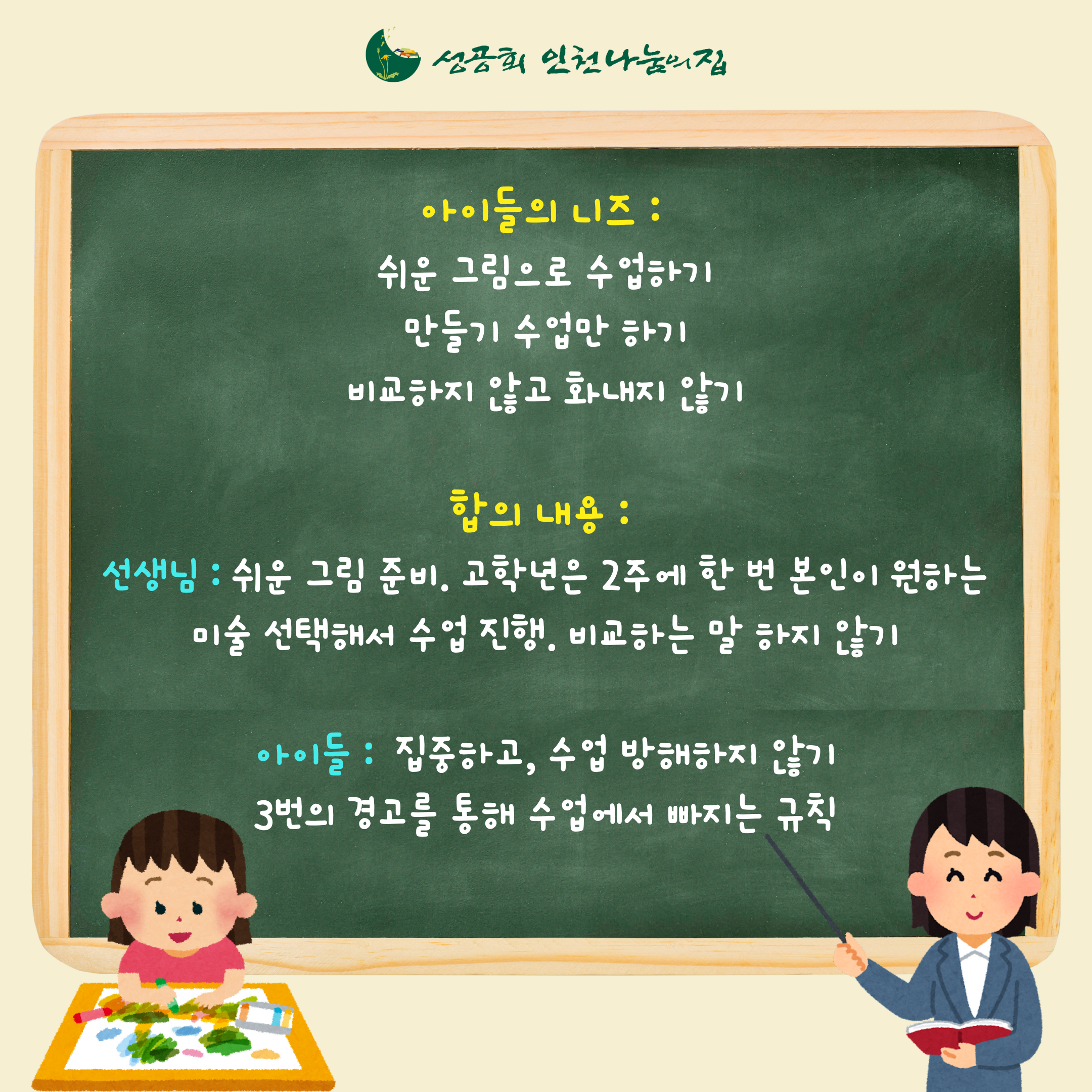 내 의견을 주장하고, 다른 친구의 의견에 귀 기울이고, 서로 얘기하며 모두 공감하는 의견을 정하기는 언제나 어렵죠. 아이들에게도 이번 회의가 쉽지 않았겠지만, 회의에서 정한 규칙들을 잘 지키며 행복한 공부방 생활을 하면 좋겠습니다!