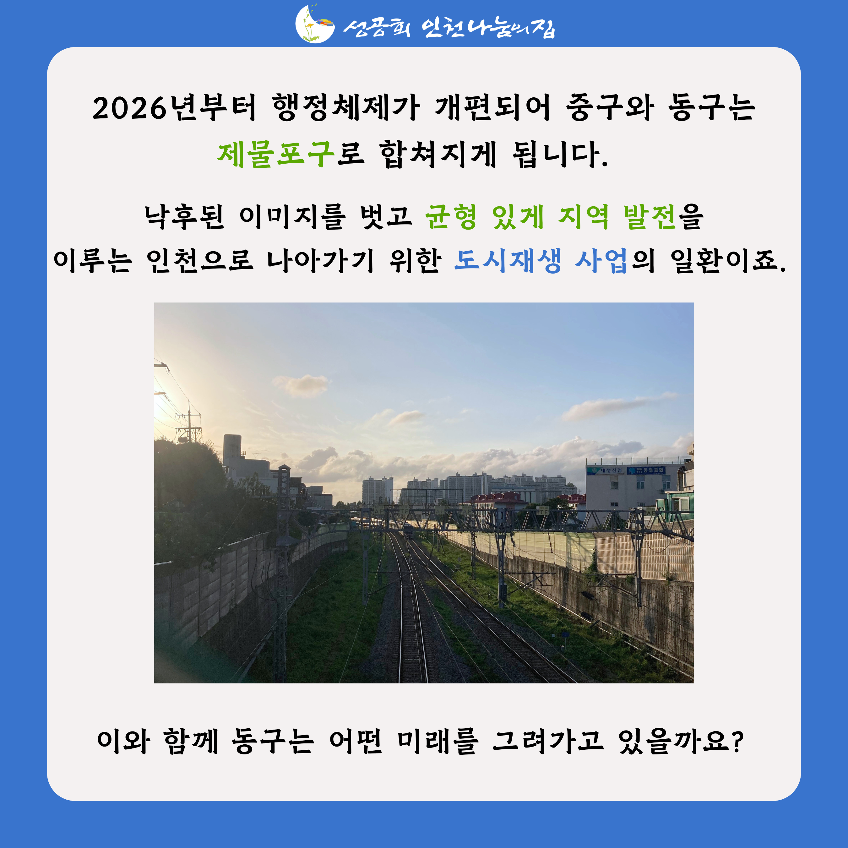 이번엔 인천나눔의집이 있는 동구의 도시 재생에 대해 몇 가지 알려드리려 합니다.