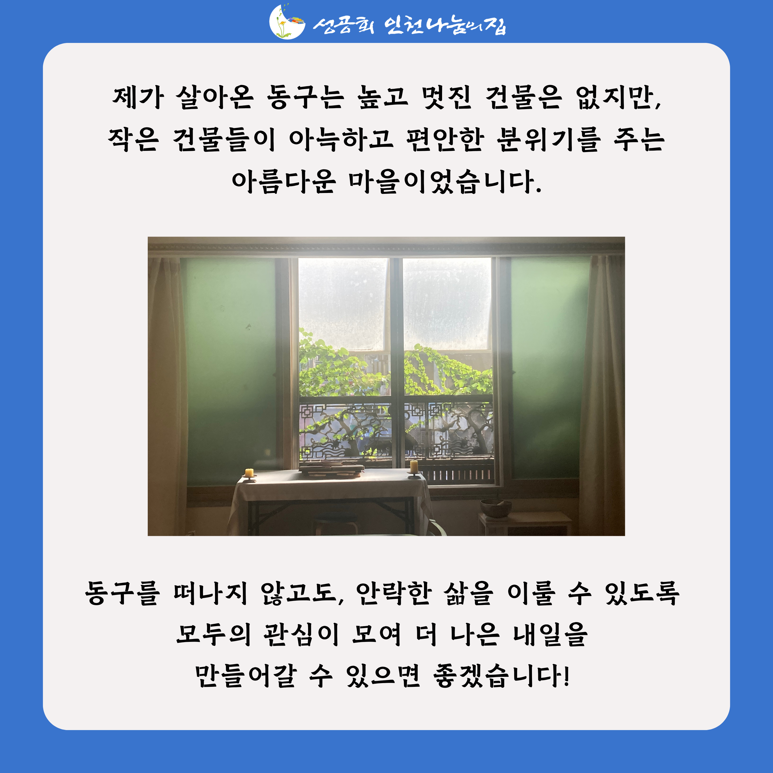 지난 7월, 인천나눔의집의 역사와 도시재생 영화를 소개했던 게시물을 기억하시나요? 과거와 현재, 미래가 함께하는 도시재생를 그리는 영화에 대해서 소개했었는데요.