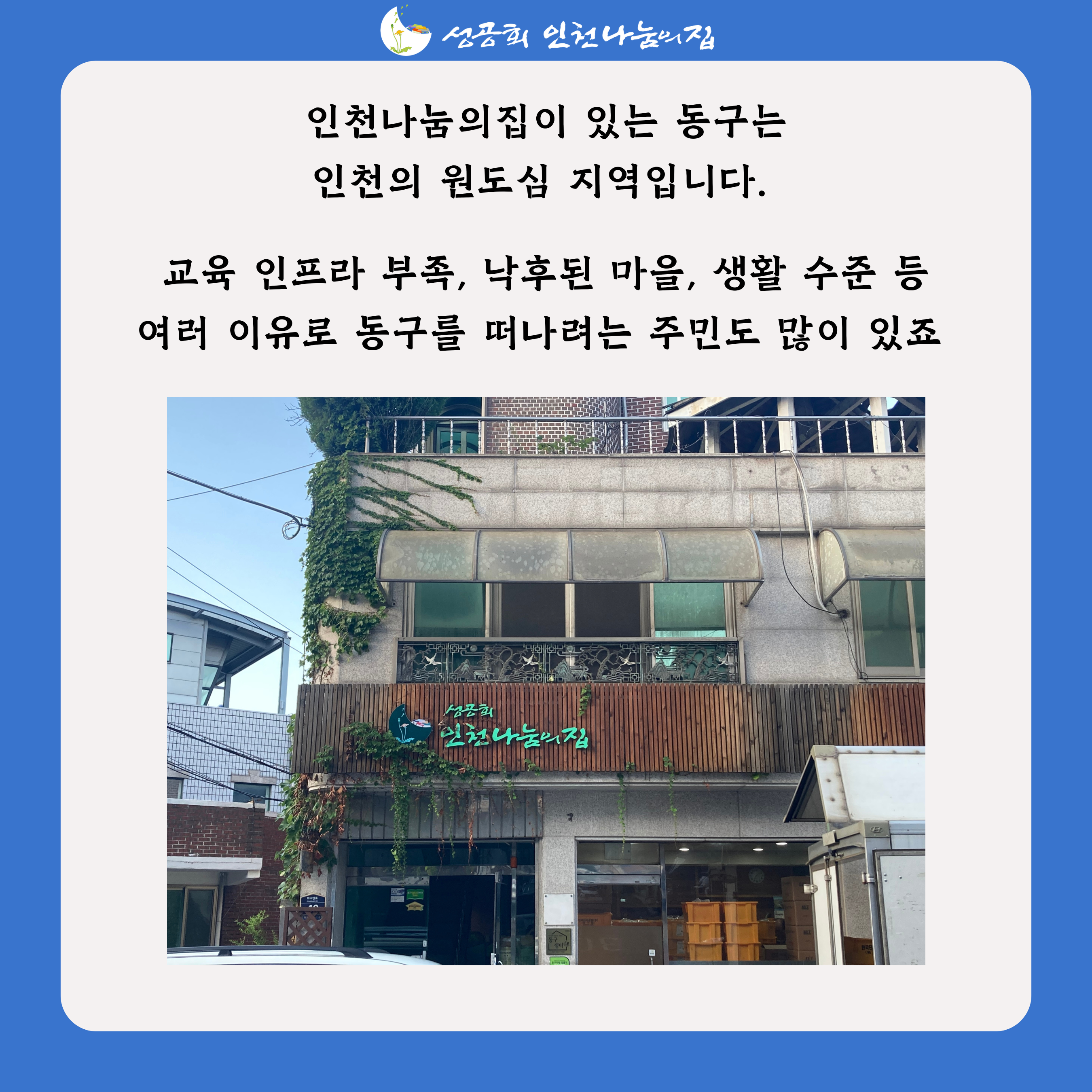 이번엔 인천나눔의집이 있는 동구의 도시 재생에 대해 몇 가지 알려드리려 합니다.