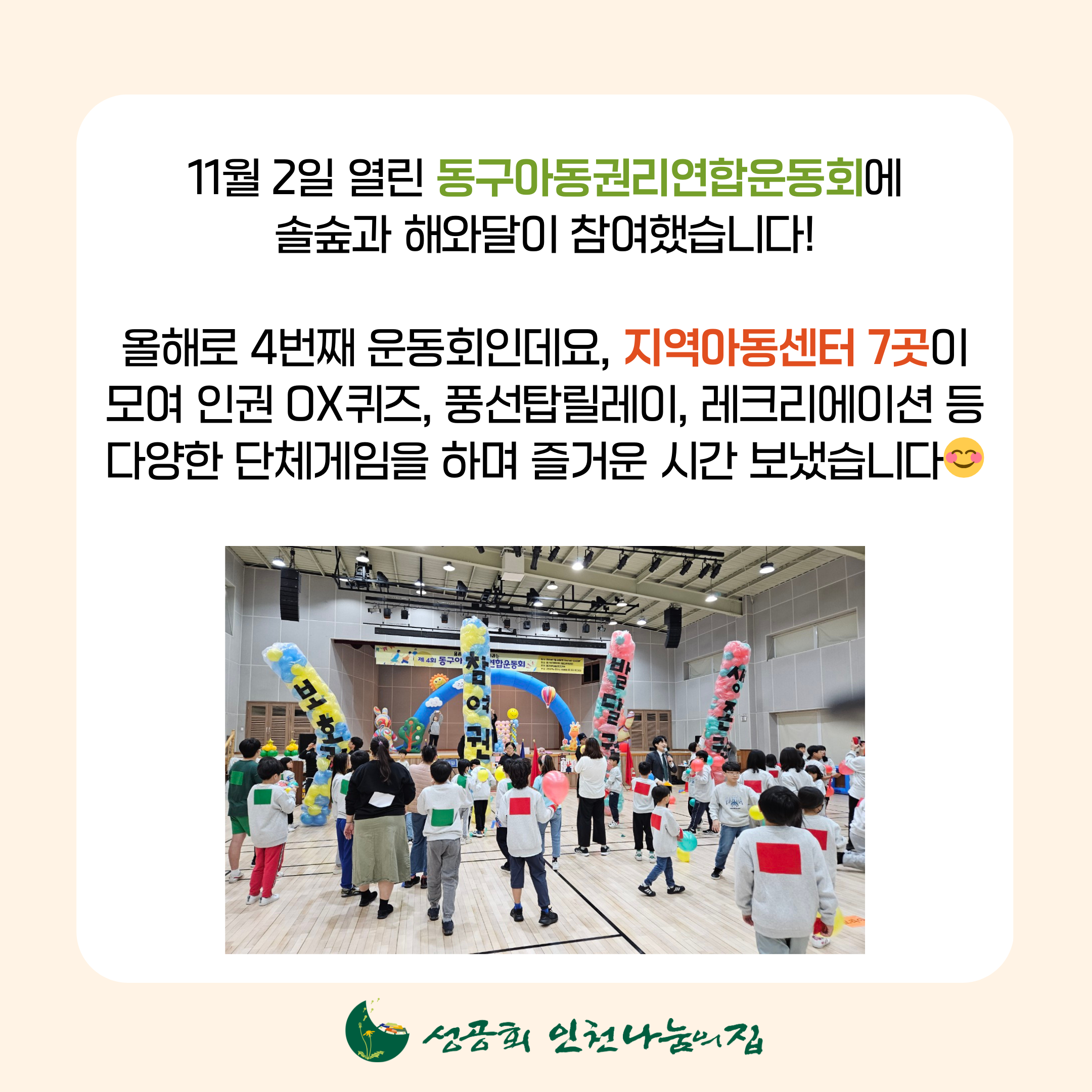 지난 11월 2일, 솔숲과 해와달은 동구 아동권리연합운동회에 참여했습니다