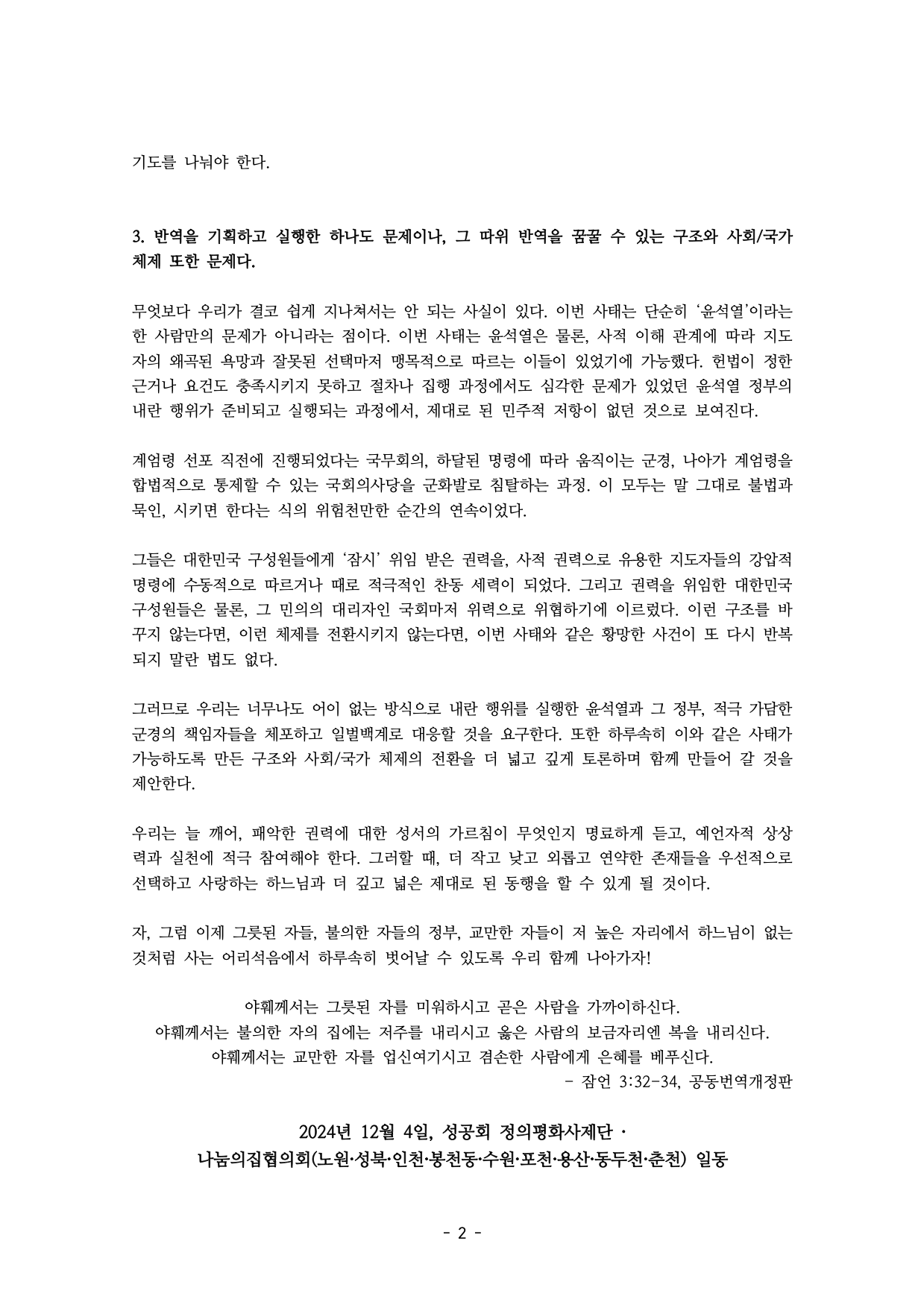 2024년 12월 4일, 성공회 정의평화사제단 · 나눔의집협의회(노원·성북·인천·봉천동·수원·포천·용산·동두천·춘천) 일동
