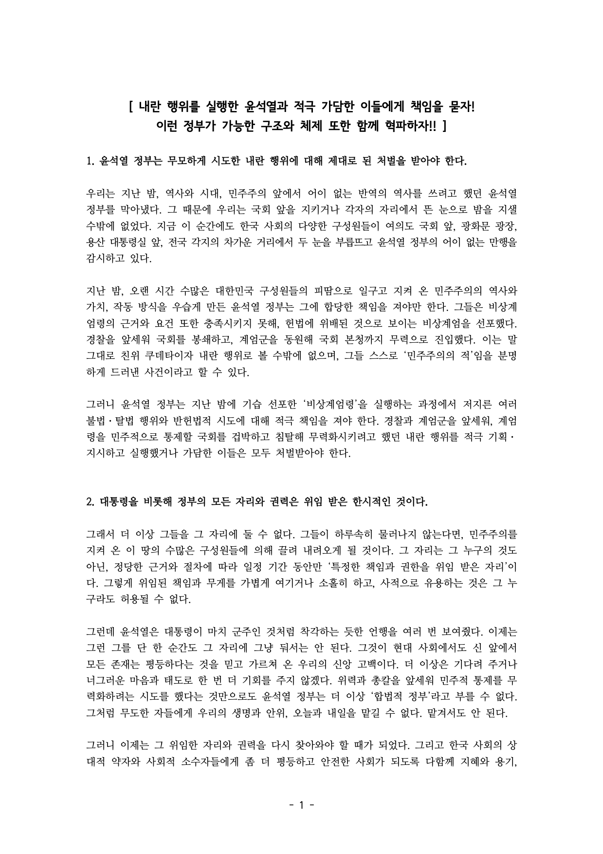 1. 윤석열 정부는 무모하게 시도한 내란 행위에 대해 제대로 된 처벌을 받아야 한다.