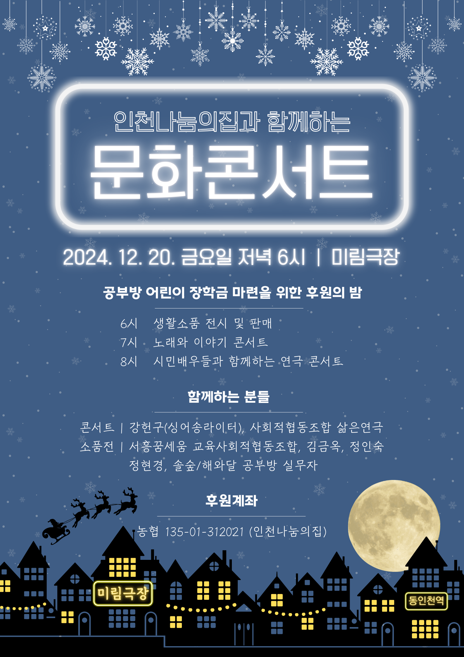 지역 내 사회적협동조합 그리고 이웃분들과 함께하는 이번 행사는, 우리 이웃분들이 정성들여 만든 <생활소품 전시 판매>, 인천의 싱어송라이터 강헌구님의 <노래와 이야기 콘서트>, 인천시민 배우분들이 열연해 주시는 <연극 콘서트: 크리스마스 캐럴>로 풍성하게 준비하였습니다.