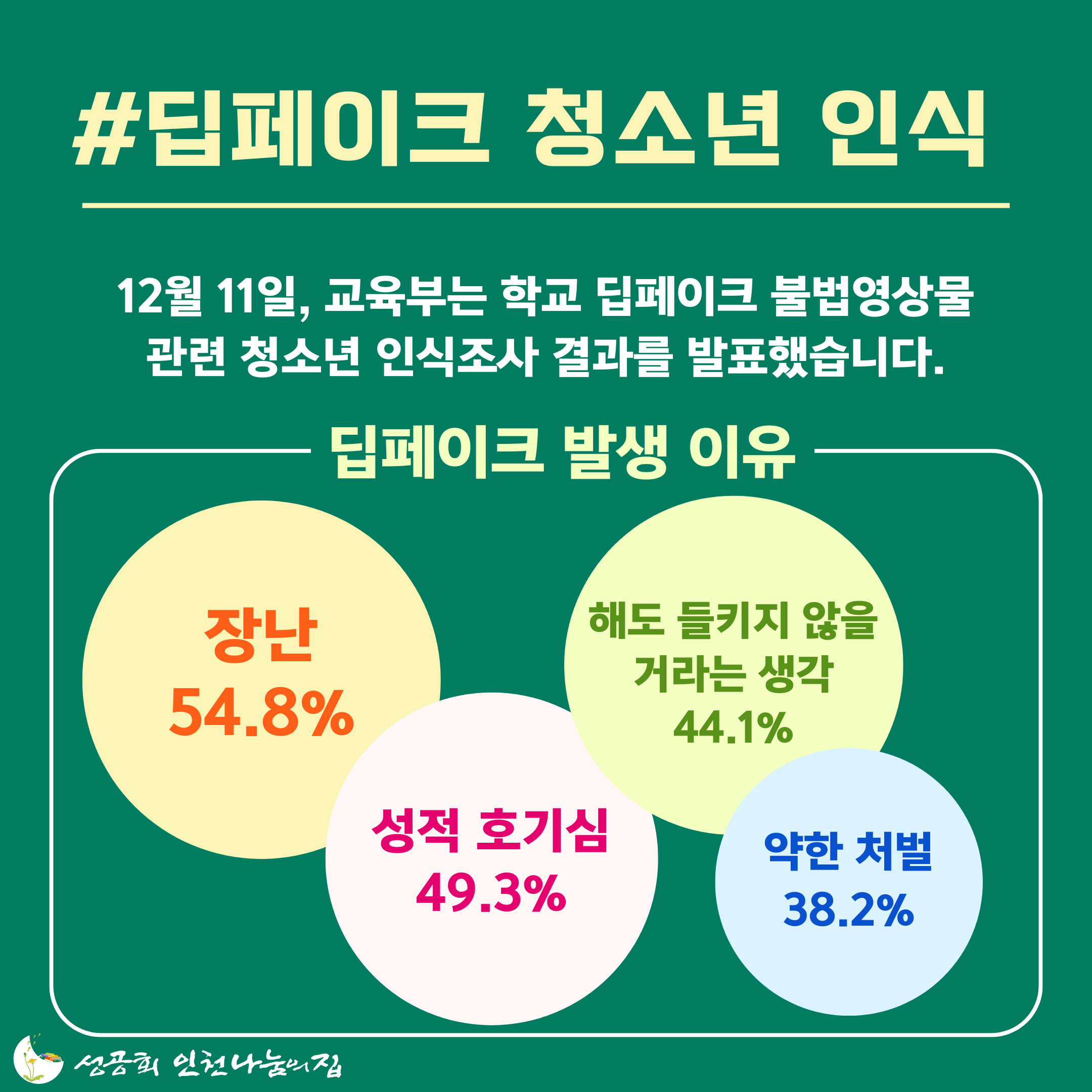 딥페이크 성범죄의 피의자 80%가 10대 청소년인데요. 교육부가 발표한 청소년 인식조사 결과를 보면, 아이들이 아직 딥페이크 성범죄를 심각하게 생각하지 않는다고 느껴집니다.