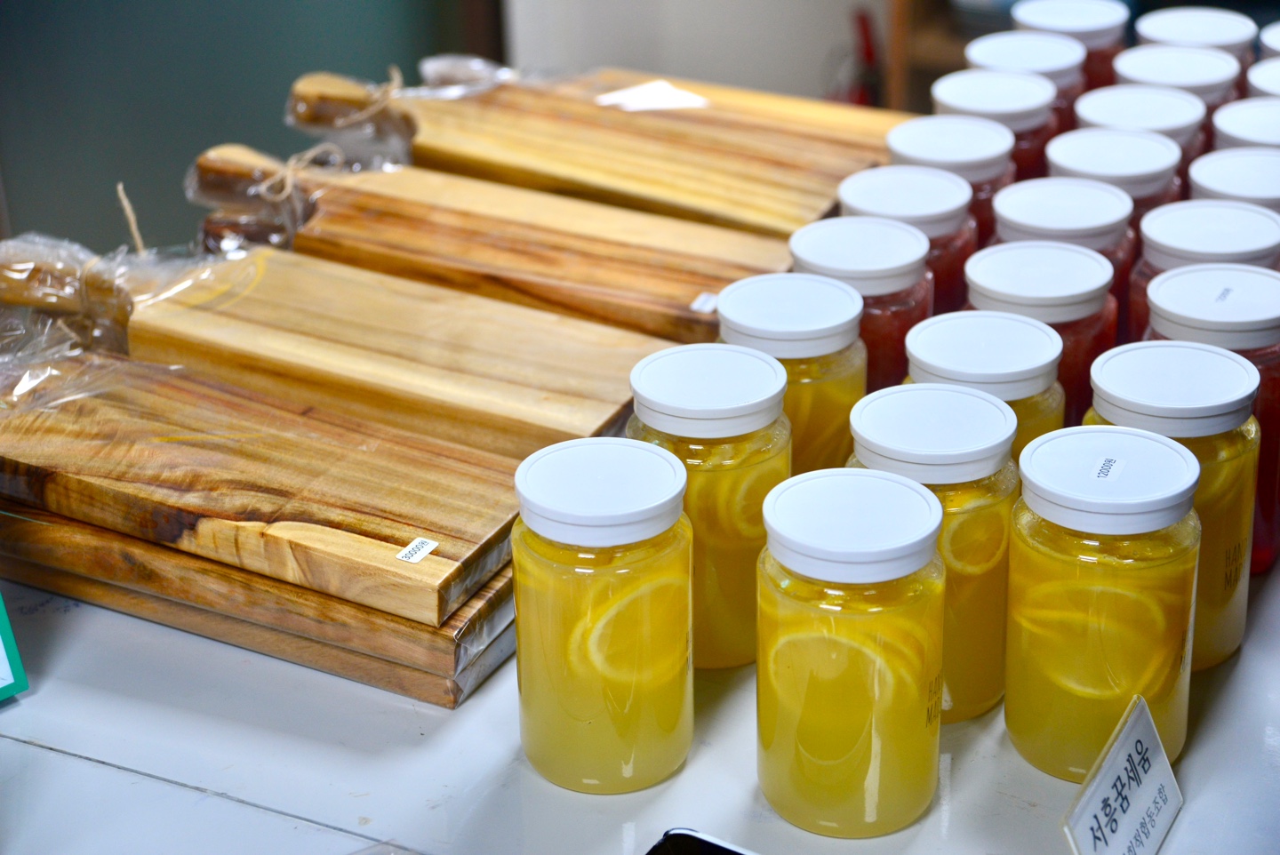 윤혜임 선생님 - 손뜨개질 공예품(좌), 서흥꿈세움 교육사회적협동조합 - 나무 도마, 레몬청, 자몽청(우)