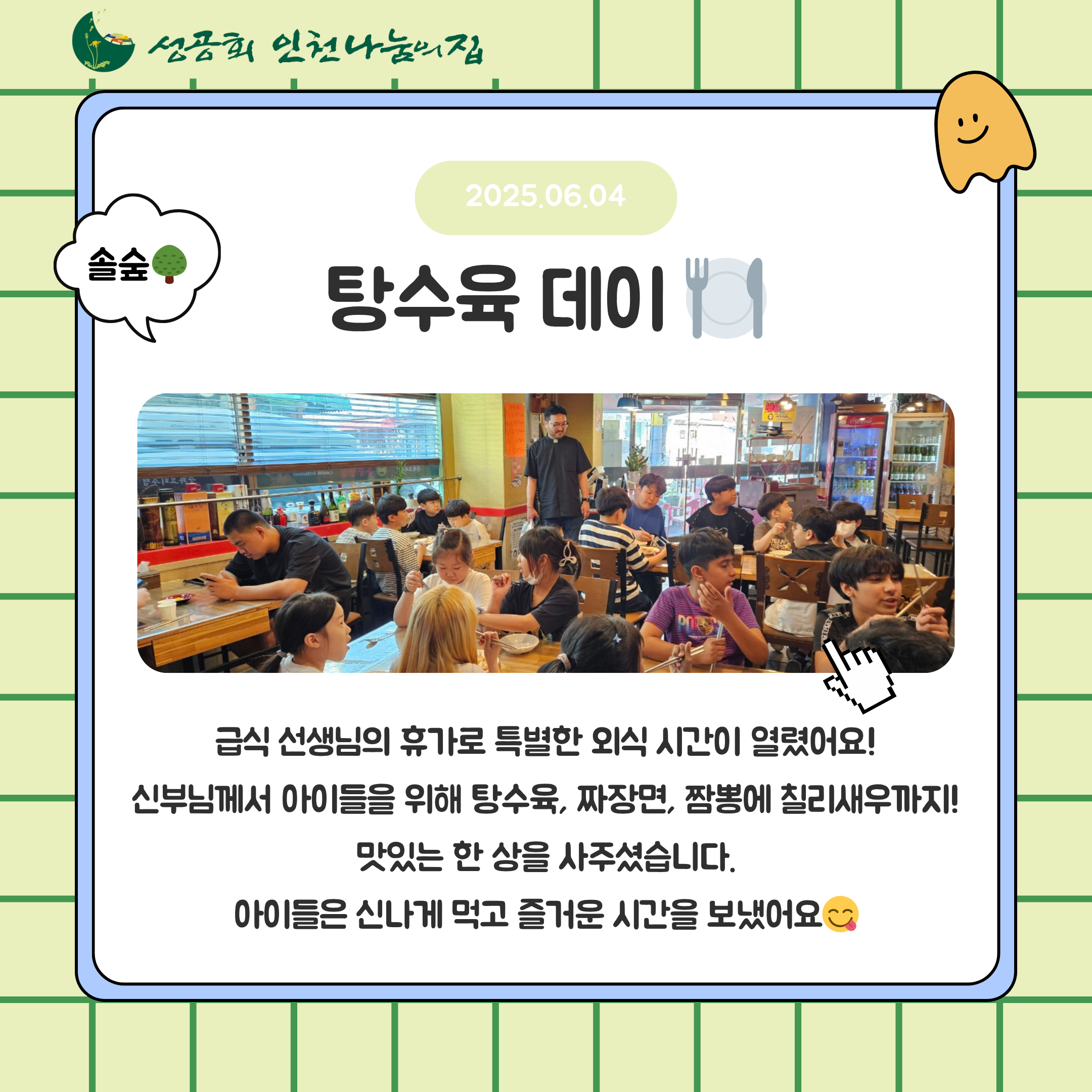 [🌳다섯가지 여름의 맛☀] (1) 2025.07.10 6월 후원 감사 인사드립니다 (0) 2025.07.02 5월 후원 감사 인사드립니다 (1) 2025.06.04 유월민주항쟁 38주년 기념 기도회 안내 (0) 2025.06.04 ≪인천나눔의집과 함께 걸어요 2차≫ 랑탕 밸리 트레킹 다녀왔습니다 (0) 2025.05.29