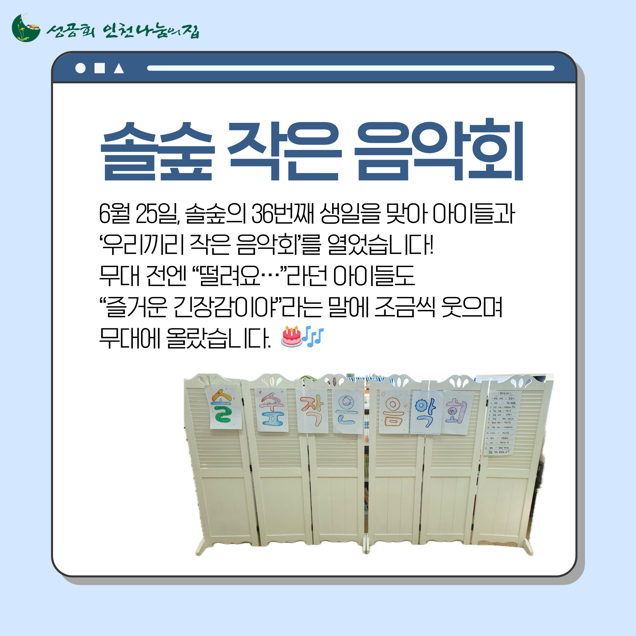 [웃음꽃이 피는 5월 이야기😄] (2) 2025.05.22 [새로운 봄, 새로운 솔숲🌱] (0) 2025.03.13 [🎄솔숲의 겨울 일상] (0) 2024.12.26 [칭찬이 힘이 되어 마음 되어 용기되어] (0) 2024.10.03 [솔숲 아이들의 여름 보내기] (0) 2024.08.29
