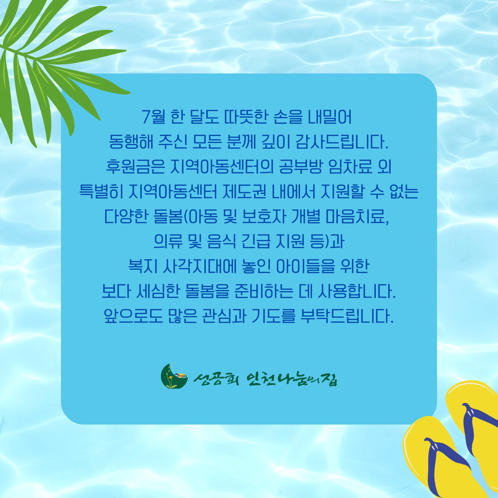 7월 한 달도 기도와 후원으로 인천나눔의집을 도와주신 모든 분께 깊이 감사드립니다!