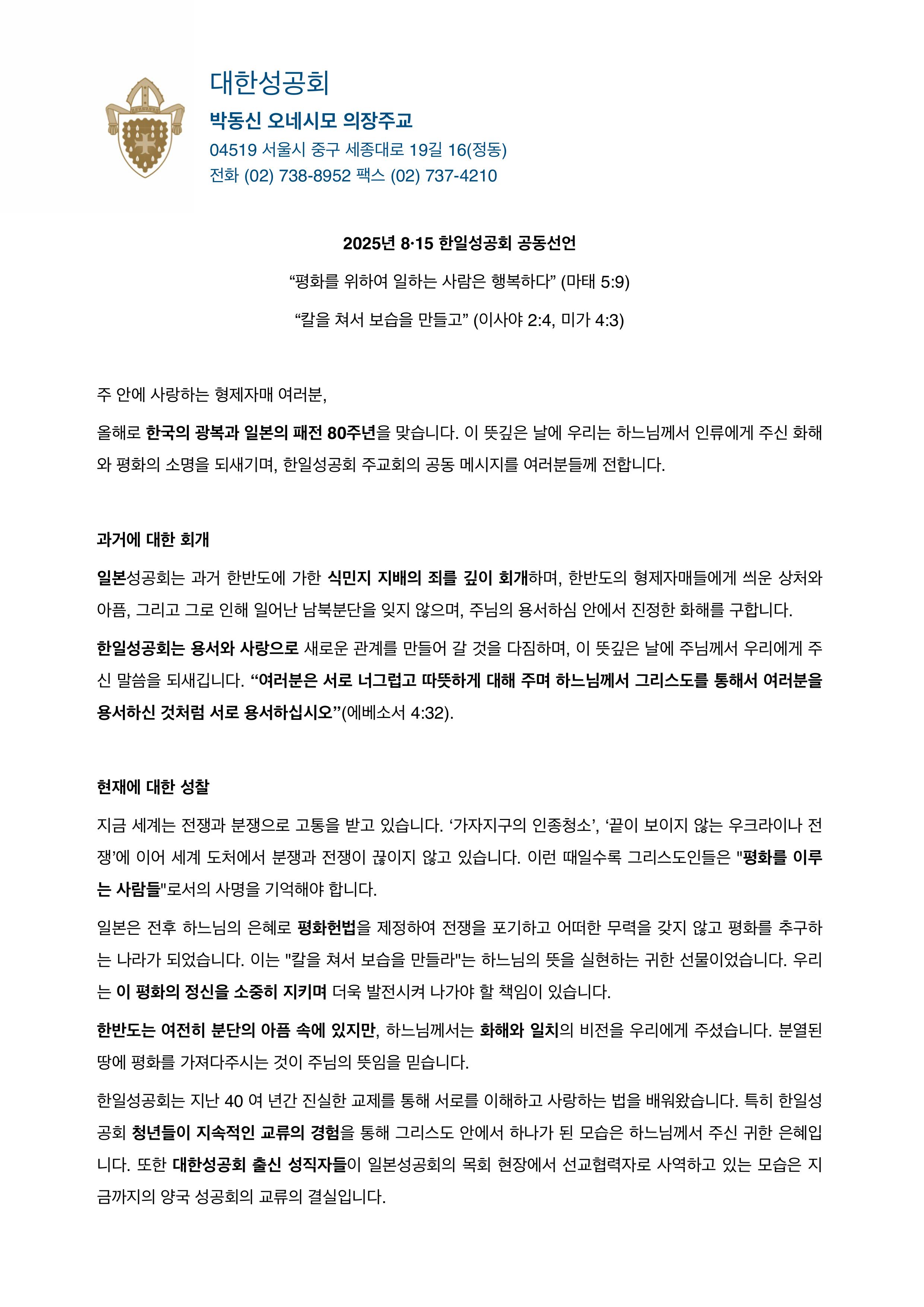 2025년 8월 15일은 한국의 광복과 일본의 패전 80주년이 되는 뜻깊은 날입니다. 이 날을 맞아 대한성공회와 일본성공회 주교회는 하느님께서 우리에게 주신 화해와 평화의 사명을 새롭게 다짐하며, 공동선언을 채택하였습니다.
