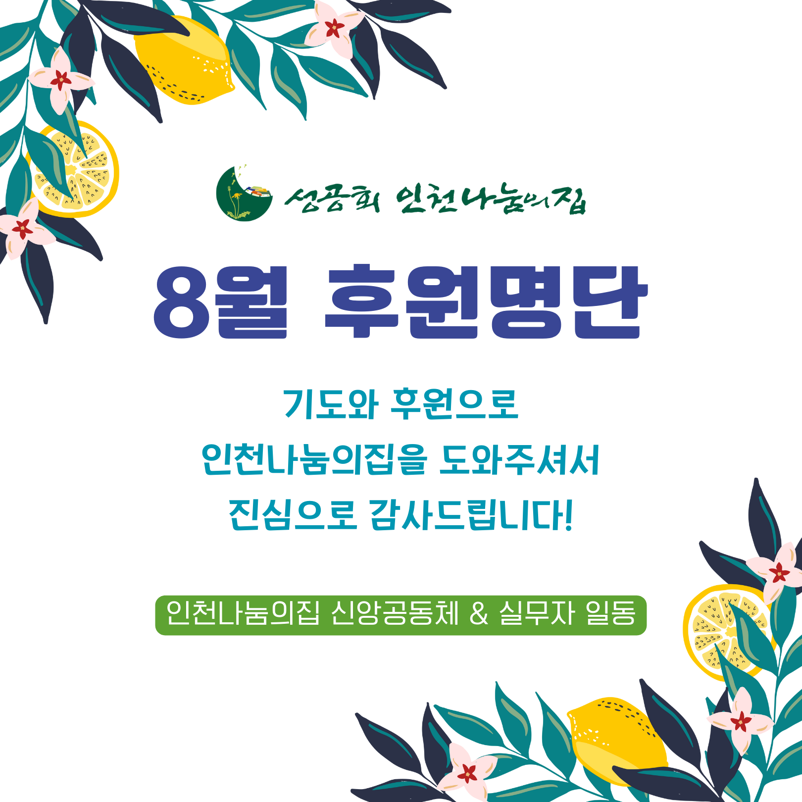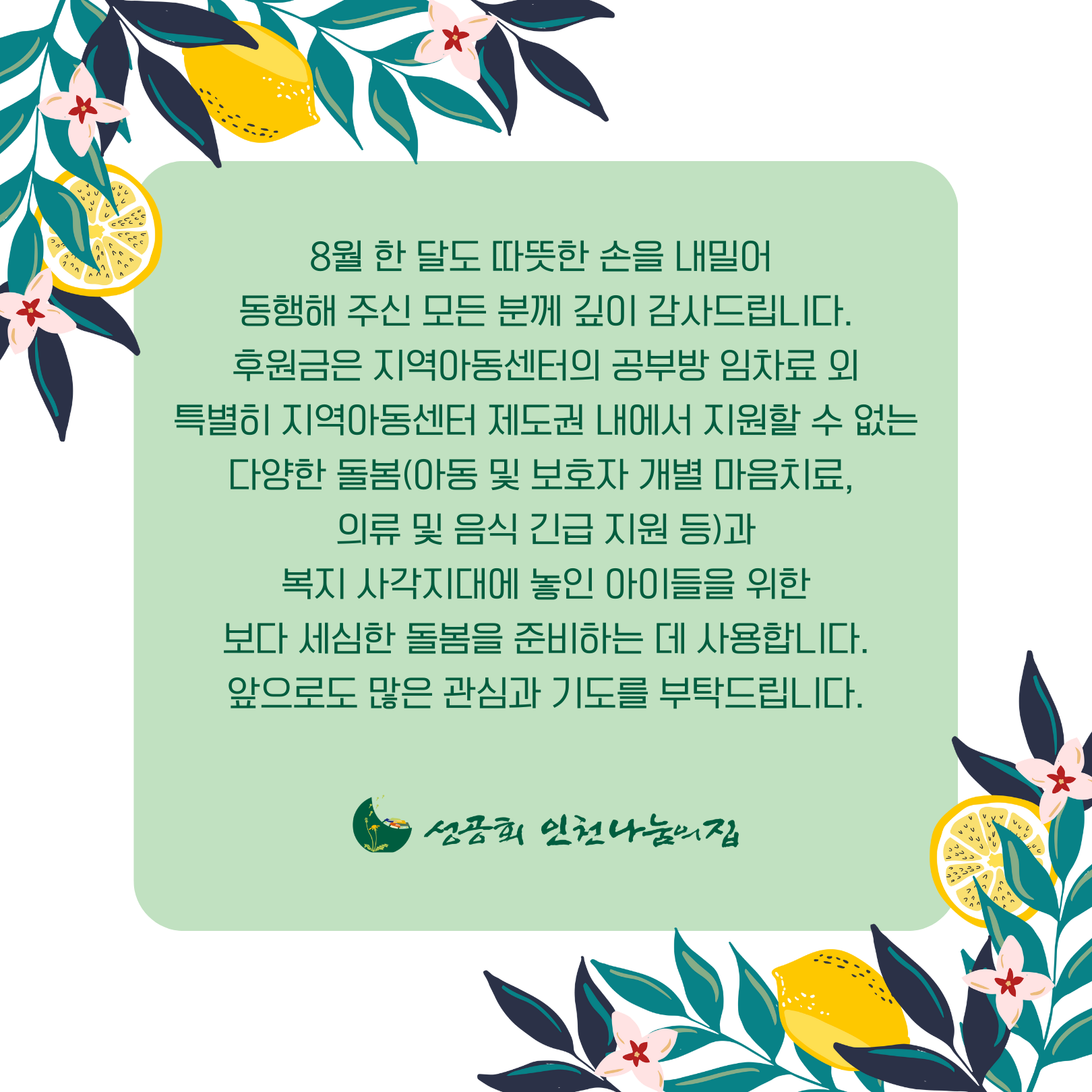 8월 한 달도 기도와 후원으로 인천나눔의집을 도와주신 모든 분께 깊이 감사드립니다!