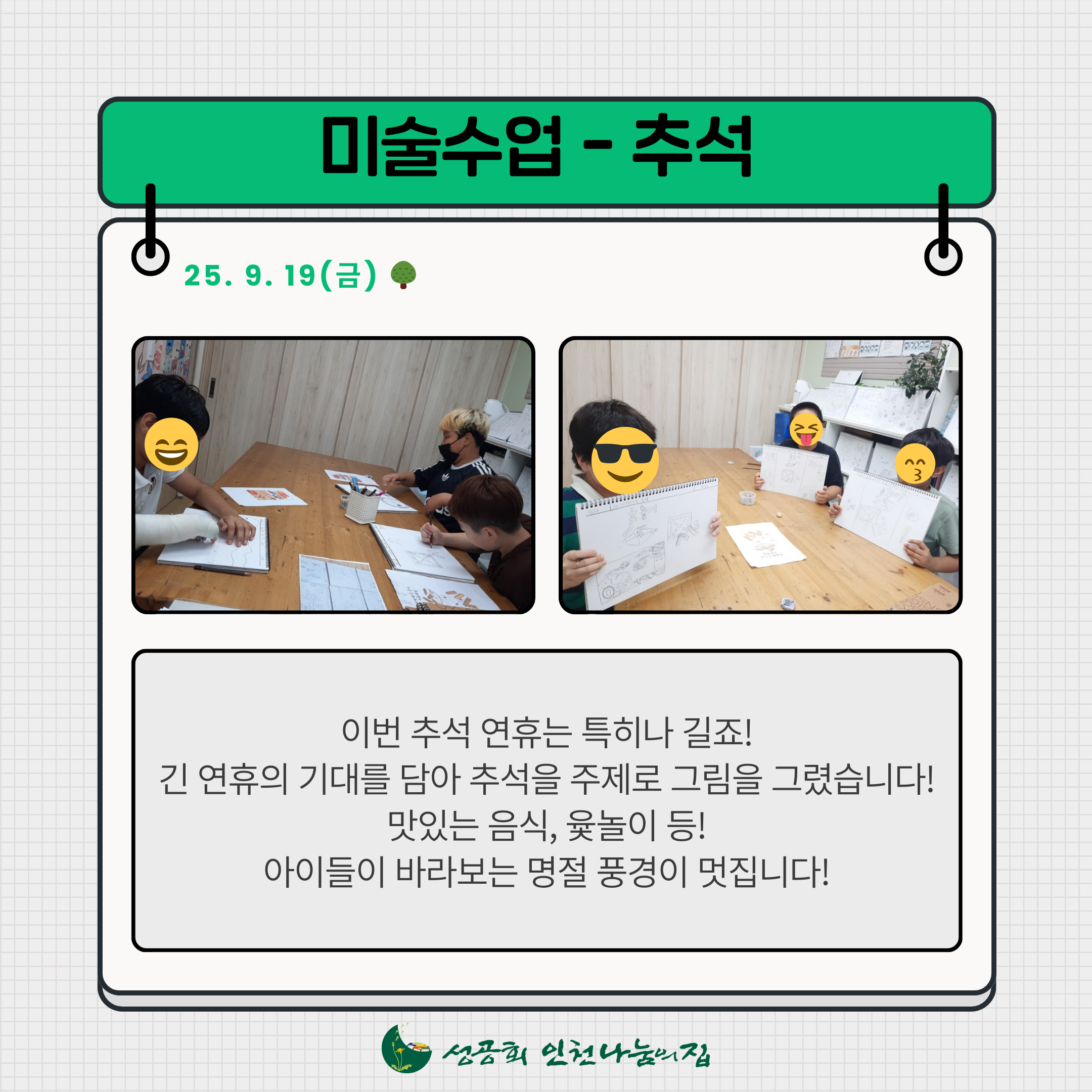 [🍁즐거운 가을 꽃피는 웃음] (0) 2025.10.16 9월 후원 감사 및 추석 인사드립니다 (1) 2025.10.02 [학기중 소소한 일상들🦋] (0) 2025.09.11 8월 후원 감사 인사드립니다 (0) 2025.09.03 [☀️솔숲&해와달의 슬기로운 여름 탐구 생활] (1) 2025.08.28