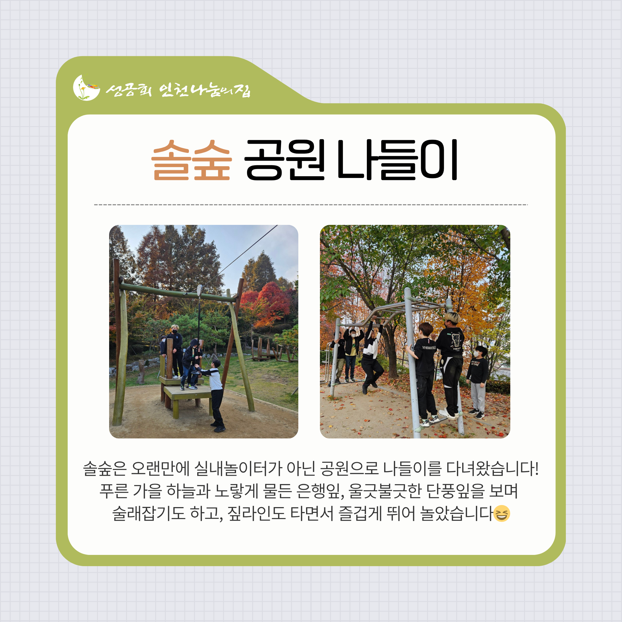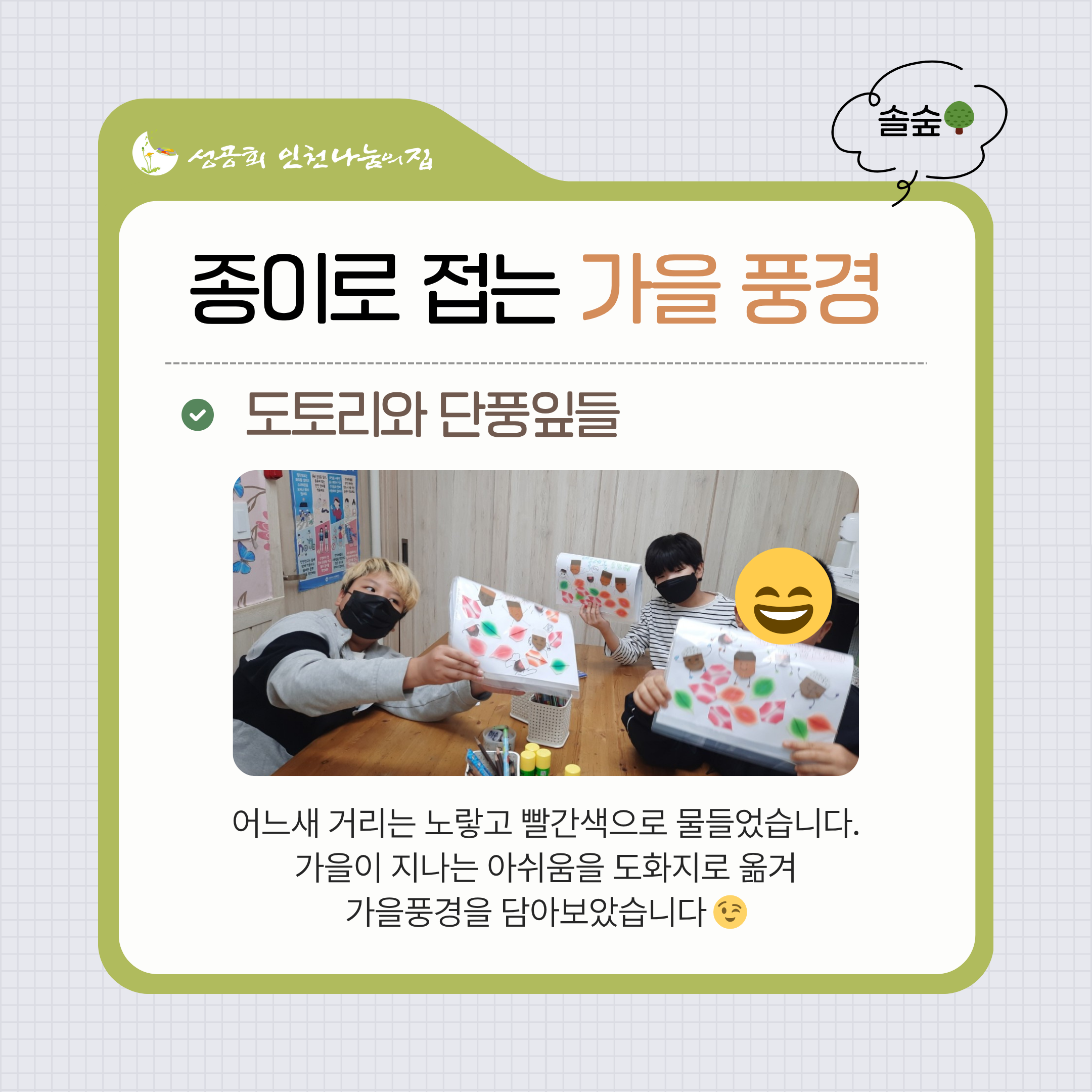 11월 후원 감사 인사드립니다 (0) 2025.12.03 [가을에 물든 아이들🍂] (0) 2025.11.27 10월 후원 감사 인사드립니다 (1) 2025.11.07 [🎨예술과 함께 자라는 솔숲&해와달] (0) 2025.10.30 [🍁즐거운 가을 꽃피는 웃음] (0) 2025.10.16