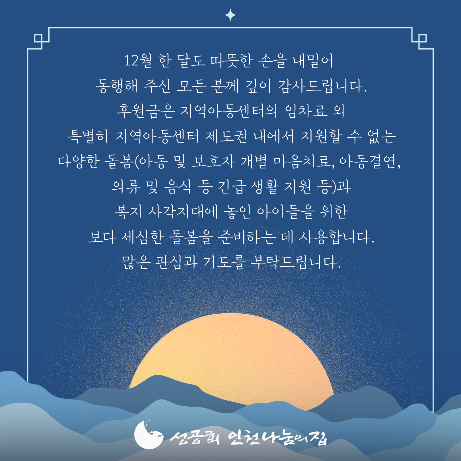 지난해 12월 한 달도 기도와 후원으로 인천나눔의집을 도와주신 모든 분께 깊이 감사 인사드립니다.