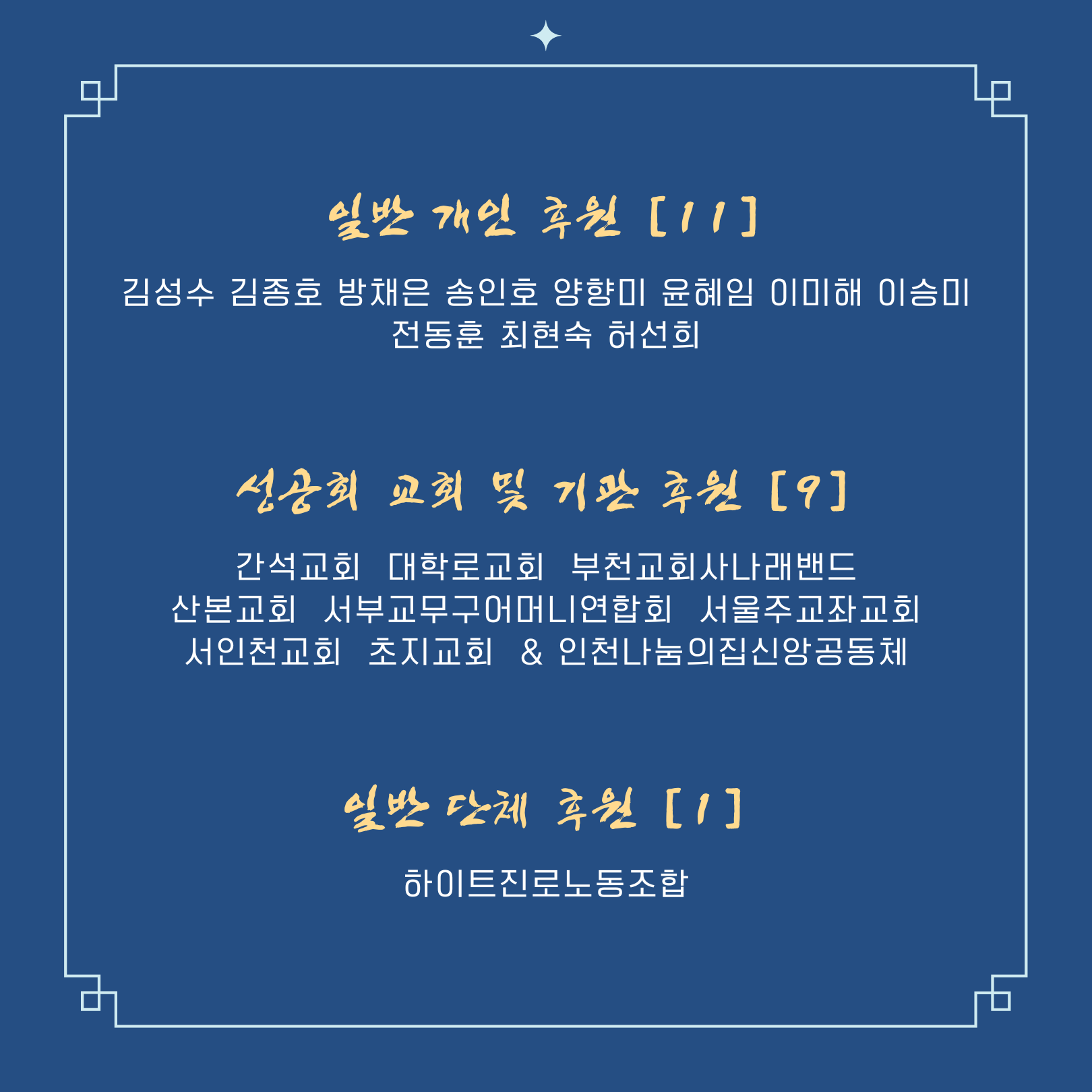 * 혹여 오기나 누락된 후원자분은 이 게시물 아래 댓글로 알려주시거나 나눔의집(032-764-0186)으로 연락주십시오.