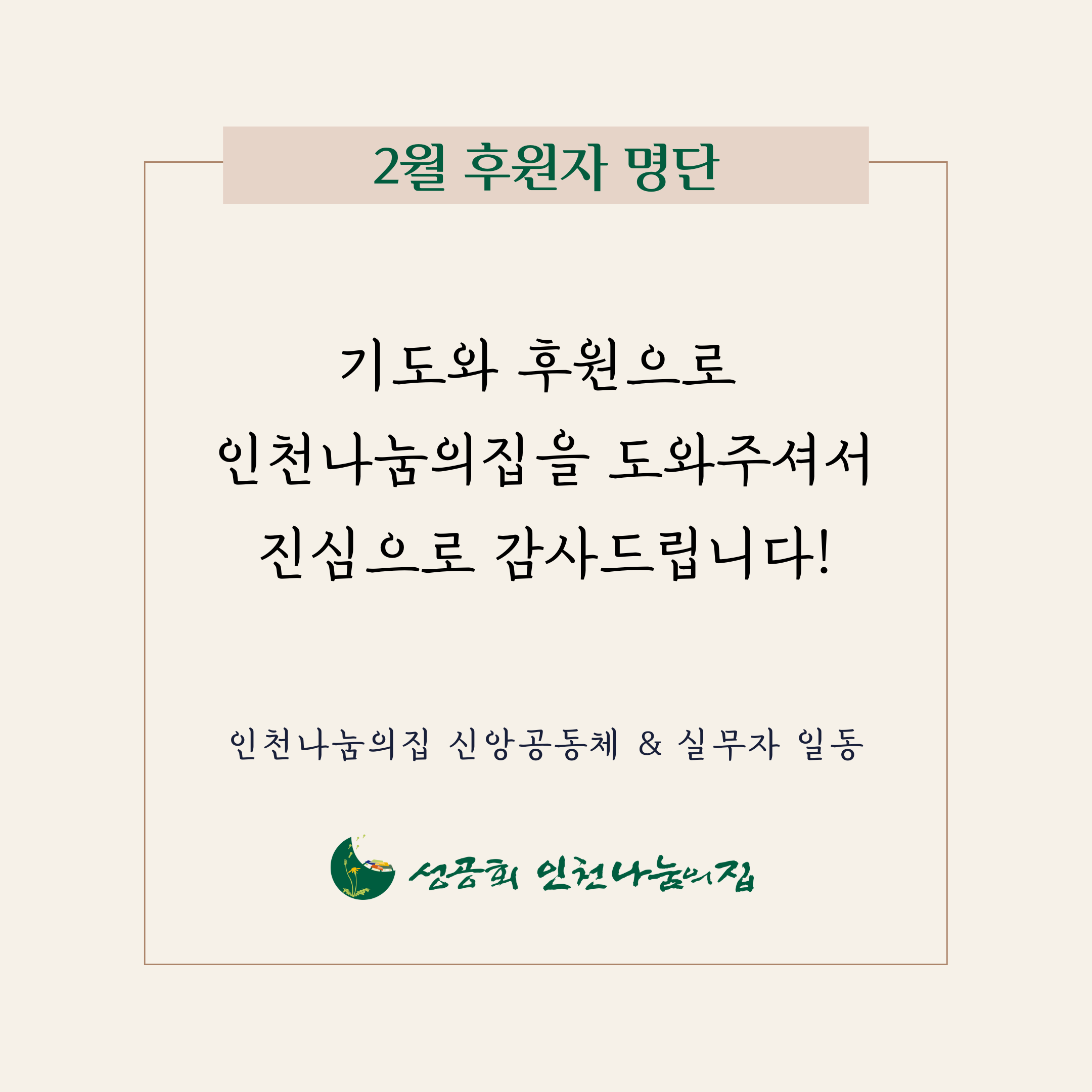 2월 한 달 동안 인천나눔의집을 위해 기도와 후원으로 도와주신 모든 분께 진심으로 감사드립니다.
