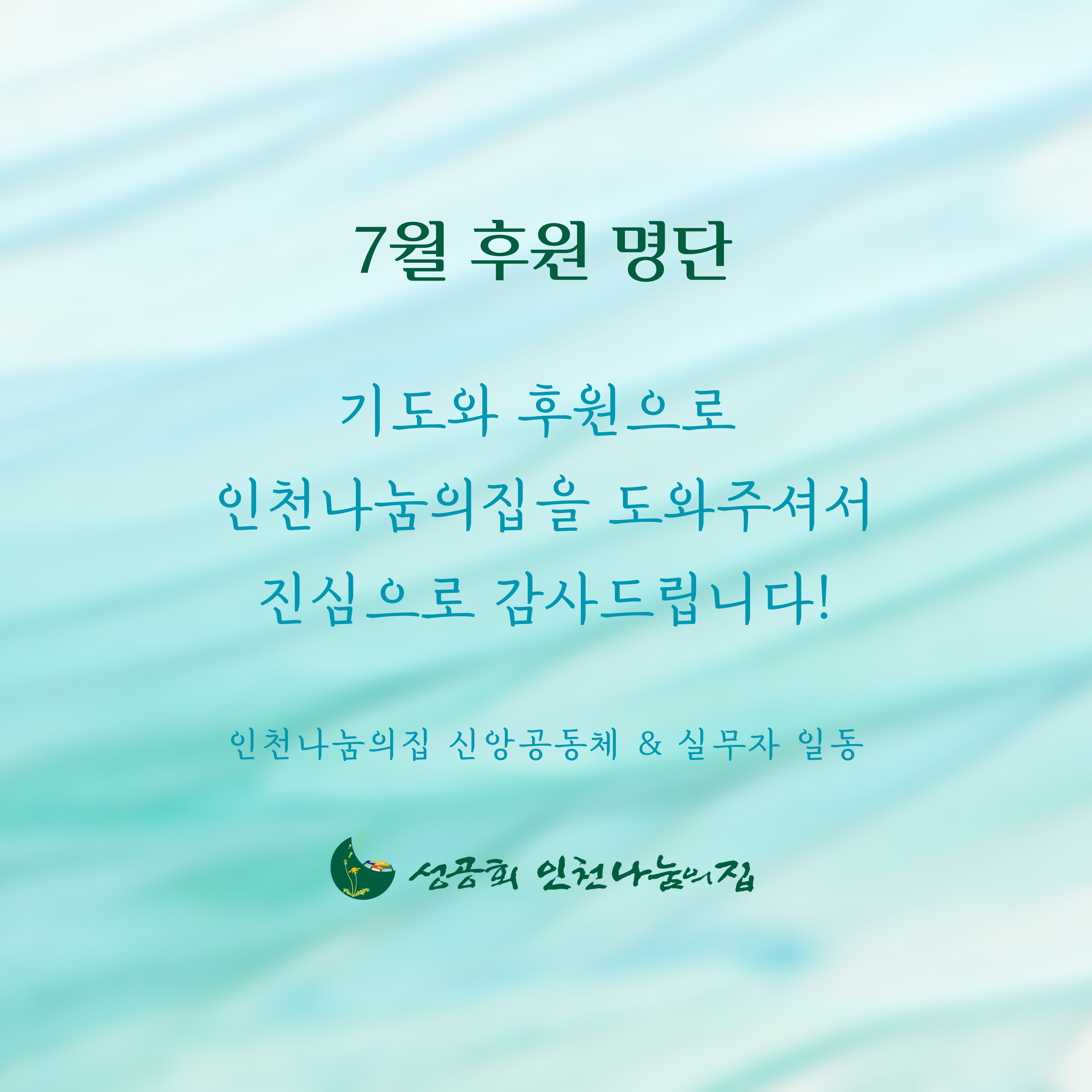 7월 한 달 동안 인천나눔의집을 위해 기도와 후원으로 도와주신 모든 분께 진심으로 감사드립니다.