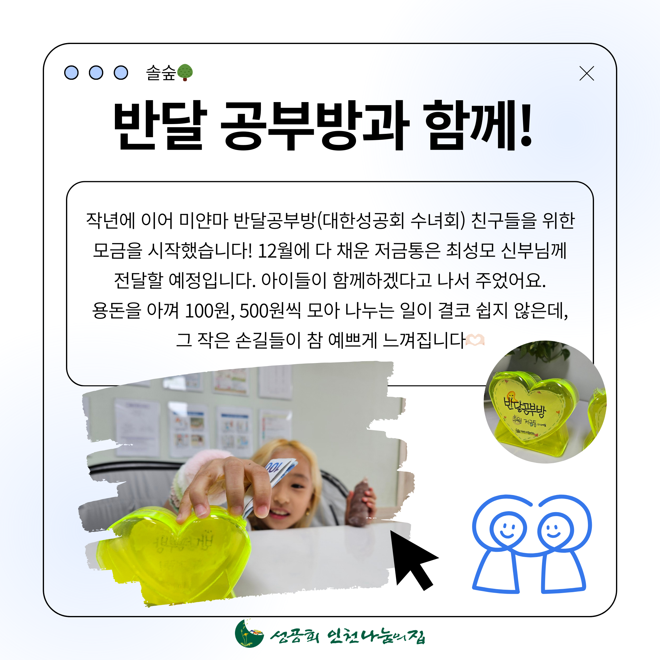 + 주님의 평화를 빕니다. 인천나눔의집 원장사제 최성모 요한입니다. 1989년 6월 25일 인천 송림동 달동네에서 시작한 인천나눔의집은 현재 두 곳의 지역아동센터를 통해 돌봄과 도움이 필요한 어